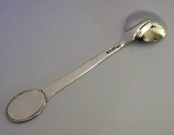 A superb rare hand made English solid sterling silver spoon. It is hallmarked for London 1995 with the makers mark being The Guild of Handicrafts. It has been superbly designed having its terminal cast in the form of the crest or coat of arms of Chipping Campden. It is in superb condition being free from dings splits and repairs. It measures approx. 6.5 inches (16.6cms) long by 1.5 inches (cms) wide across the bowl and weighs 39 grams. A beautifully made rare example.