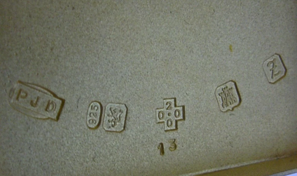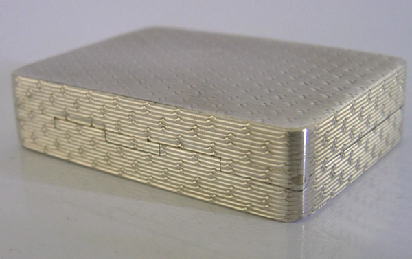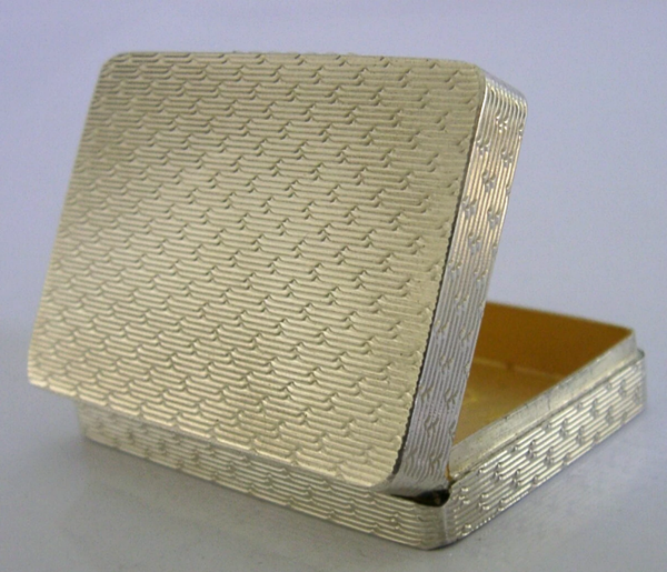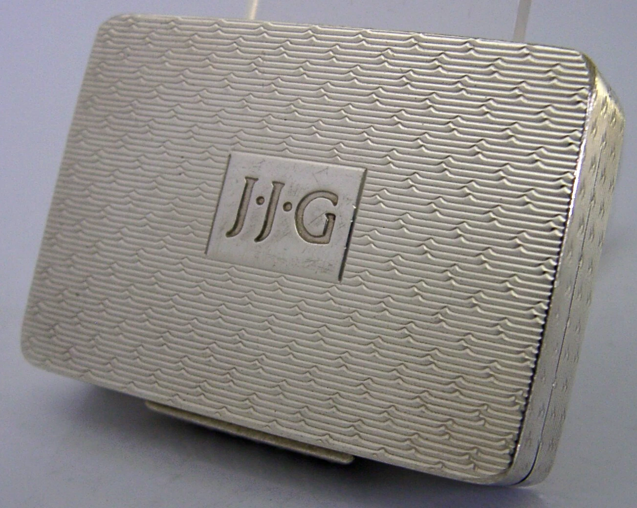A super quality solid sterling silver box. It is hallmarked for Edinburgh 2000 with the maker being PJD for Peter John Doherty, made for Gallagher's who had links to Aspreys and Garrards. It has a stylish engine turned design and is in super condition being free from dings splits distortions and repairs. The hinge is smooth and tight, the lid tight fitting. The JJG (J J Gallagher) logo is on the base. It measures over 2 inches (5.4cm) across by over 1.5 inches (3.7cm) wide by 0.5 inch (1.2cm) tall and weighs 66grams. A very high quality example.