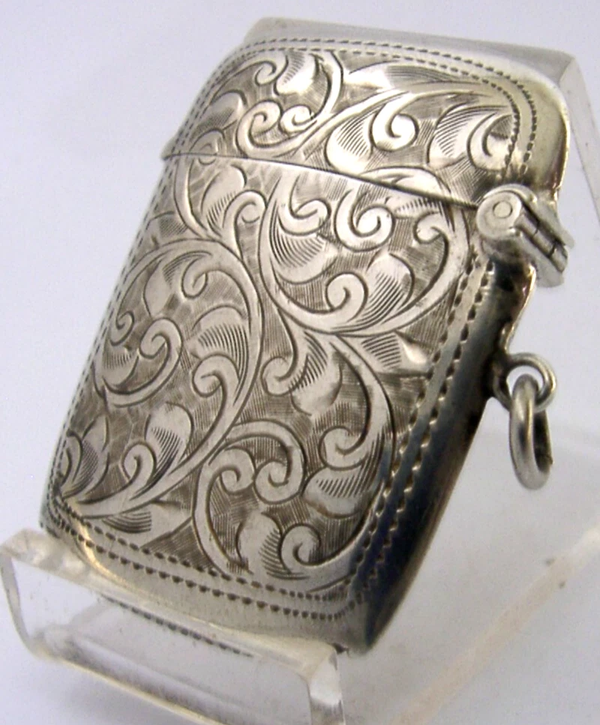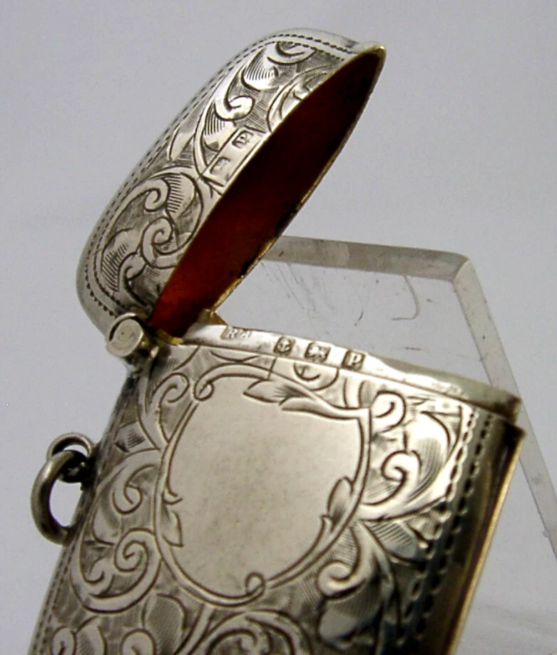 A quality English antique solid sterling silver vesta case. It is hallmarked for Birmingham 1914 with the maker being Rolason Brothers. It has been superbly designed being finely engraved with scrolls and has a vacant cartouche, the inside has been internally gilded. It is in super condition being free from dings splits holes and repairs. It measures over 1.75 inches (4.8cm) tall by over 1.25 inches (3.5cm) wide and weighs 16 grams. A beautifully made piece.