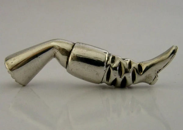 A superb English novelty solid sterling pipe tamper. It is hallmarked for London 1981 with the makers mark being CAP. It has been superbly designed being in the form of a leg, almost certainly a copy of a Georgian example. . It is in super condition being free from dings splits holes and repairs. It measures approx. 2 inches (5.2cm) long by 0.25 inch (1.2cm) wide and weighs 26 grams. A well made example.