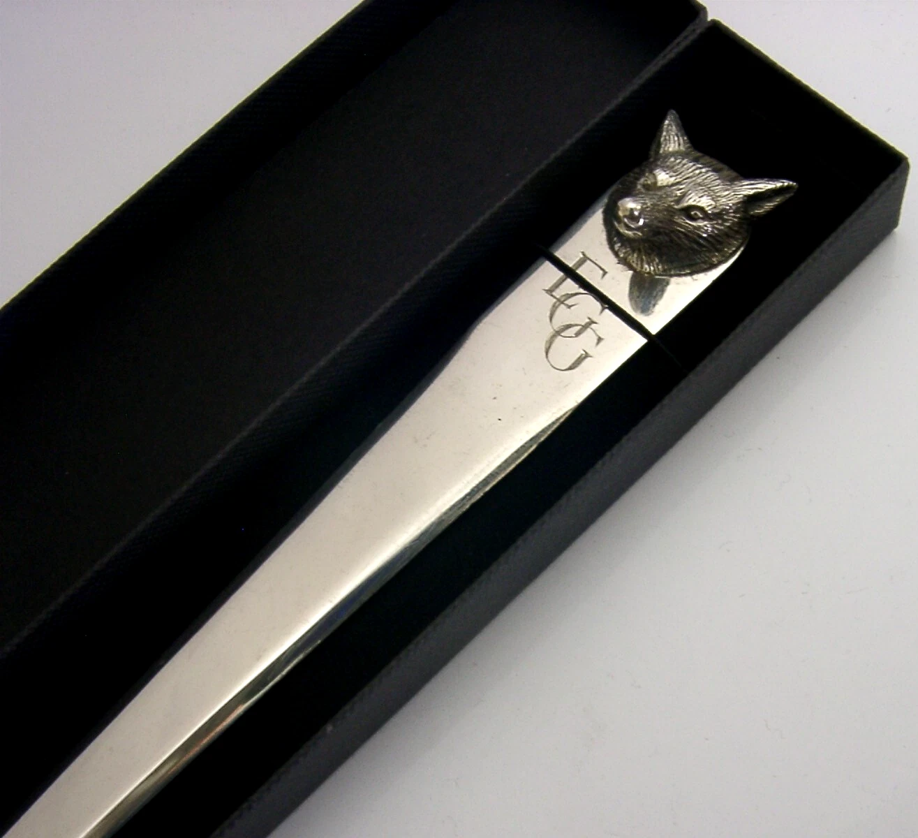 FOX ENGLISH SOLID STERLING SILVER LETTER ENVELOPE OPENER 1976 HUNTING eng EGGA super quality solid sterling silver letter opener. It is hallmarked for Birmingham 1976 with the maker’s marks being JBC&sLd. It has been superbly designed being cast with a fo