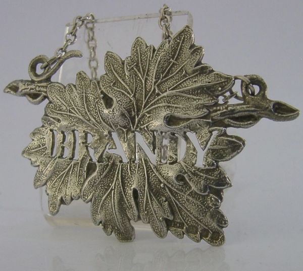A very nice quality English solid sterling silver brandy wine decanter label. It is hallmarked for London 1968 with the makers mark being SMD. It has been well designed in the form of a vine leaf and is in superb condition being free from dings splits holes and repairs. It measures approx. 2.5 inches (6.5cm) wide by 1.5 inches (3.6cm) tall excluding the chain and complete with its chain weighs 14 grams. A very nicely designed piece.