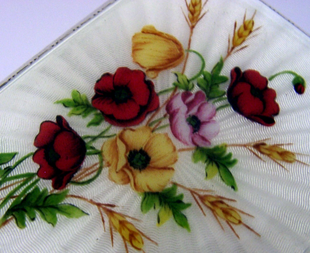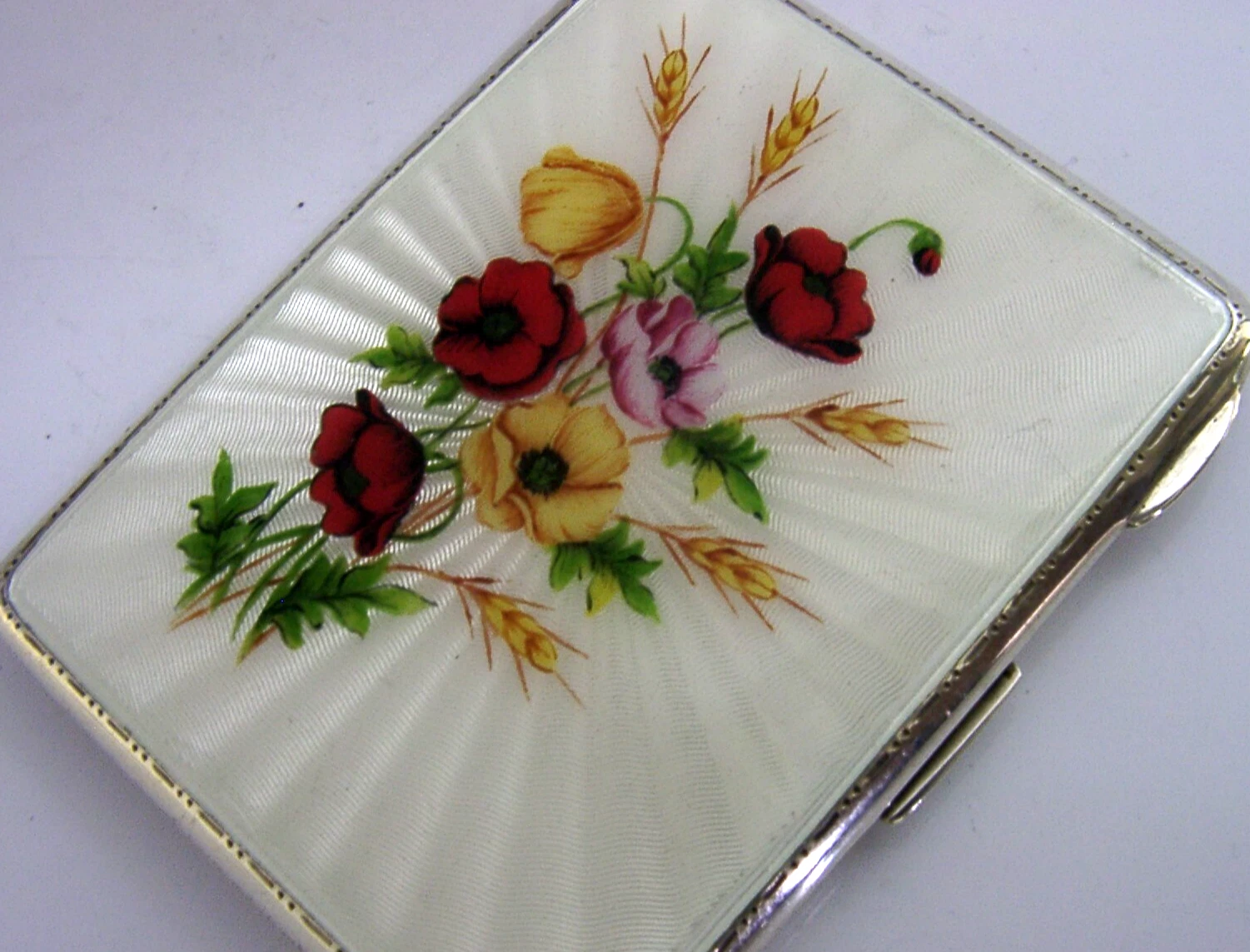 SUPERB STERLING SILVER ENAMEL HAND PAINTED POPPIES FLOWER CIGARETTE CASE 1961