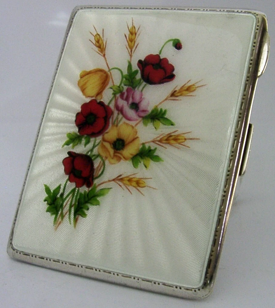A stunningly beautiful and rare solid sterling silver and enamel cigarette case. It is hallmarked for Birmingham 1961 with the maker being Walker & Hall. It has been beautifully made having a hand painted scene of poppies to its front. It is in superb condition being free from dings splits and repairs, the gilding inside is perfect. The enamel is complete and free from chips repairs scratches and cracks. It measures approx. 3.5 inches (8.8cm) by 2.75 inches (7cm) wide and weighs 100 grams. A beautifully designed rare piece.
