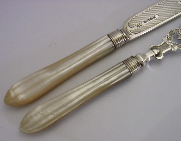 A superb set of English Victorian antique solid sterling silver servers. One piece only is hallmarked for Birmingham 1859 however they are both silver and clearly a set. They have been beautifully designed with mother of pearl handles and are in superb condition being free from dings splits and repairs, and no chips cracks or repairs to the handles. The fork measures over 7 inches (18.2cm) long the other piece 8.75 inches, combined they weigh 108 grams. A very nice quality set.