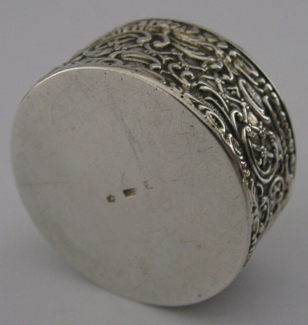 A beautiful German solid silver snuff or trinket box. It is marked with the German 800 standard mark and a makers mark. I would date it to c1920s. It has been beautifully made with the lid being cast over mother or pearl. It is in super condition being free from dings splits chips cracks holes and repairs, the inside is clean and gilded and the lid fits well. It measures approx. 1.5 inches (3.6cms) across by 1.6cms tall and weighs 26 grams. A very pretty piece.