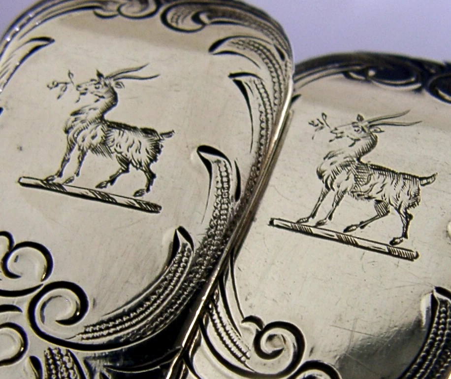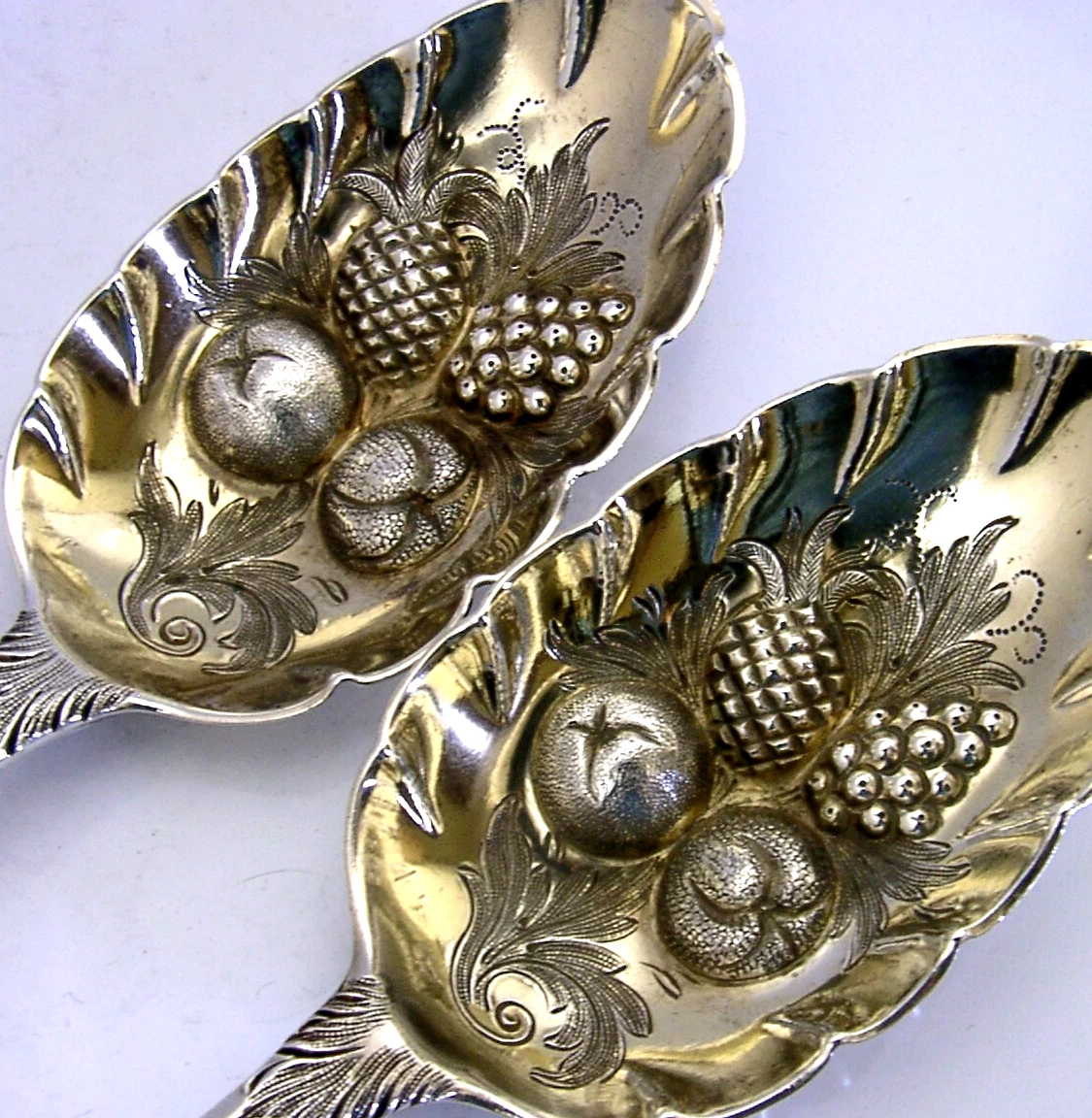 A stunning pair of English Georgian antique solid sterling silver berry serving spoons. They are hallmarked for London 1816 with the maker being Thomas Wilkes Barker. They have been superbly made being embossed with fruit and interestingly pineapples. Their terminals have been engraved with a goat crest similar to that used by the Bordeleys, Bordeleys, Bordeley and Bordeloys (and similar spelllings) Families. They are in superb condition being free from dings splits distortions and repairs. They measure over 8.5 inches (21.8cm) long by over 1.75 inches (4.8cm) wide and combined weigh 148 grams. A super quality early pair.