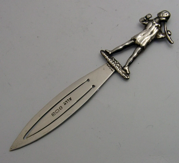 A rare English antique solid sterling silver bookmark or page marker. It is hallmarked for Birmingham 1927 with the maker being Adie and Lovekin. It has been made in the form of Little Boy Blue. It is in super condition being free from dings splits splits and repairs. It measures approx. 3 inches (7.7cm) long and weighs 2 grams. A rare example.