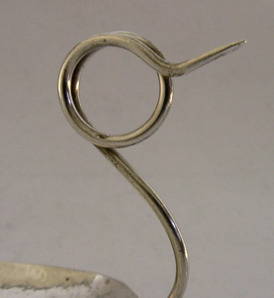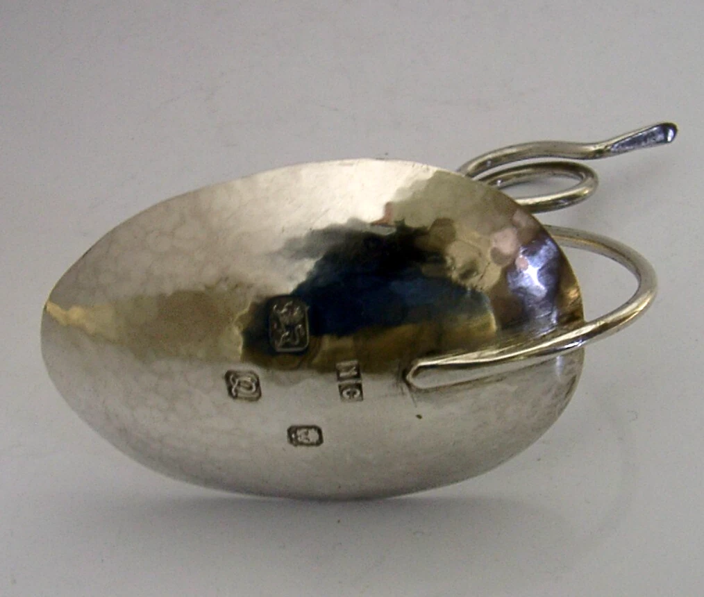 A beautiful rare Arts and Crafts antique solid sterling silver spoon. It is hallmarked for London 1990 with the maker possibly being Norman Cheyney. It has been superbly made with the bowl being plannished the handle being looped - possibly a copy of or inspired by a Roman or Iron Age piece. It is in superb condition being free from dings splits and repairs. It measures over 3.25 inches (8.4cm) long by 2 inches by 3 inches tall and weighs 40 grams. A superb example.