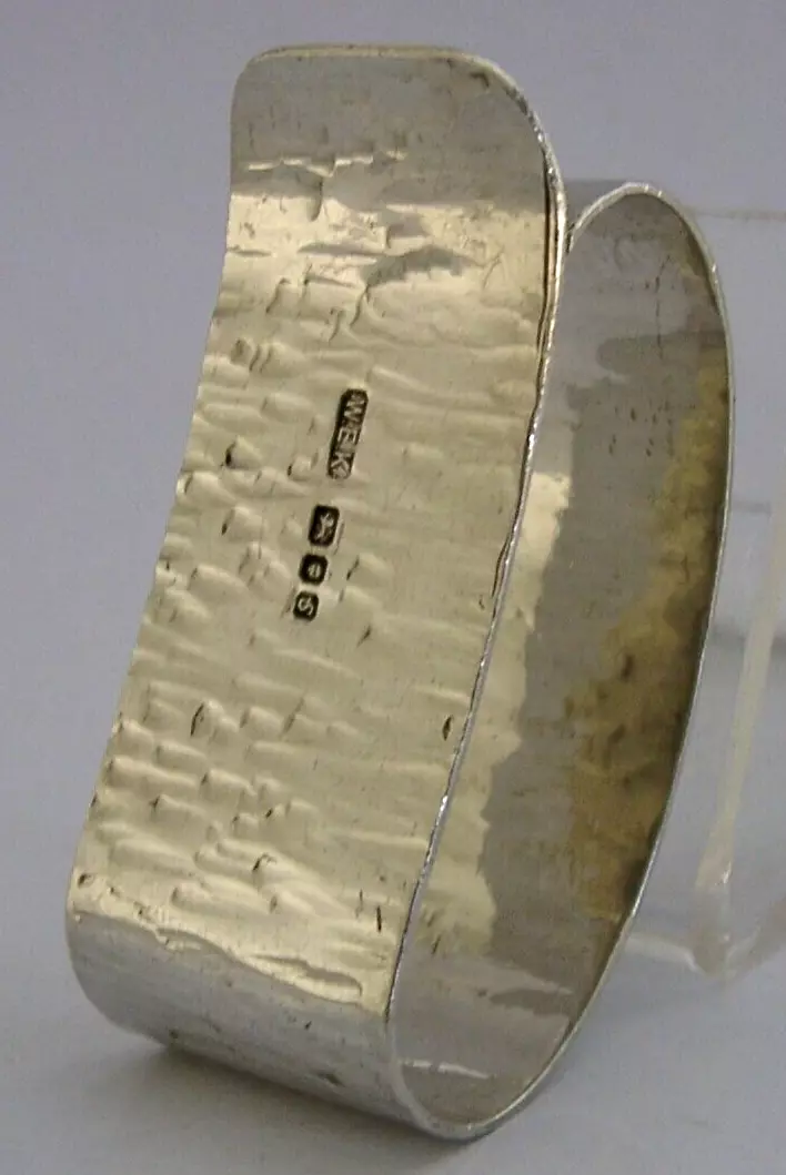 A very nice quality solid sterling silver napkin ring. It is hallmarked for London 1973 with the maker being Walter Edward King. It has been stylishly designed being planished and has the single initial M or W. It is in super condition being free from dings splits and repairs, no engravings. It measures approx. 2.25 inches (5.6cm) across by almost 1 inch (2.4cm) wide by over 1 inch (2.8cm) tall and weighs 26 grams. A very well made stylish piece.