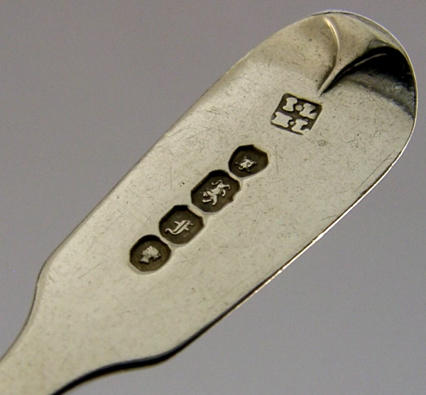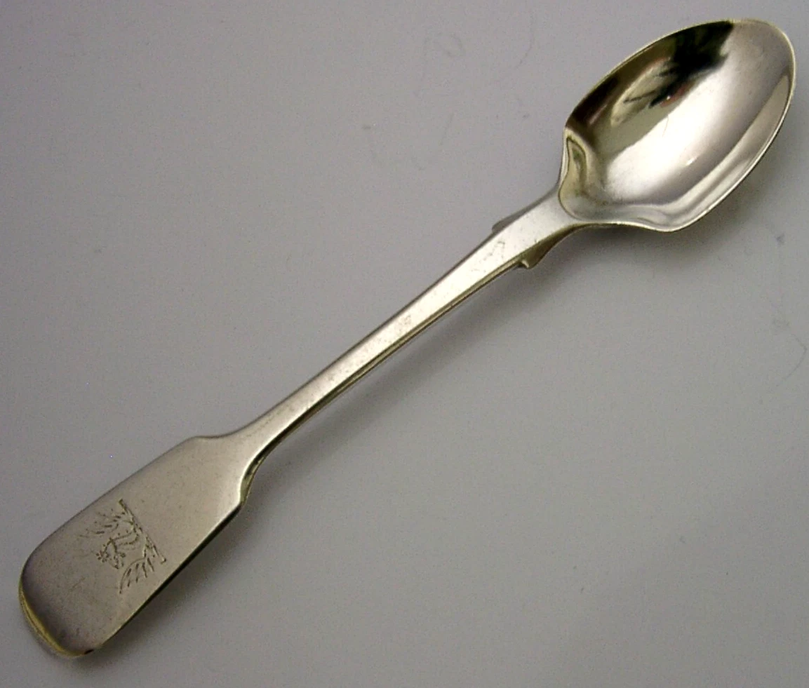 A rare antique English solid sterling silver egg spoon. It is hallmarked for London 1841 with the maker being IL over HL. It has been superbly made and has been engraved with a crest used by the Dalton family. It is in superb condition being free from dings splits distortions and repairs. It measures approx. 4.75 inches (12cm) long by 1 inch (2.6cm) wide and weighs 15 grams. A very interesting example.