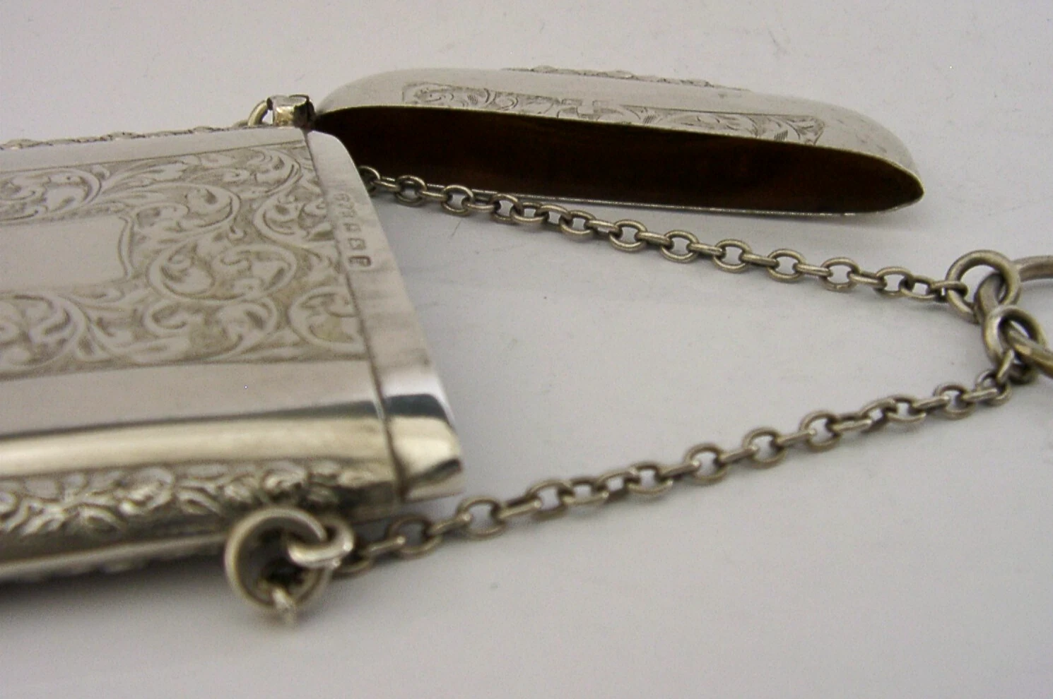 A very stylish English antique solid silver ladies card case. It is hallmarked for Birmingham 1916 with the maker being EJH. It has been superbly made having a chain and finger loop and being finely engraved with scrolls and decorated with roses around its edges. The inside has been gilded. It is in superb condition being free from dings, splits, holes and repairs, just a tiny mark to the reverse - see final photo. It measures approx 4.25 inches (10.4cm) by 3 inches excluding the chain and loop and weighs 71 grams. A beautifully designed high quality example.
