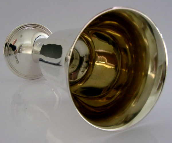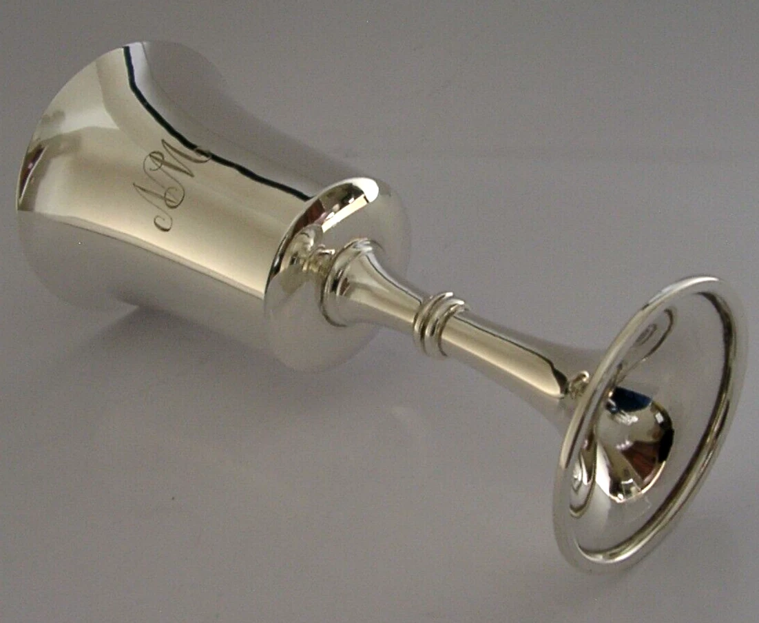 A beautiful good sized stylish solid sterling silver goblet. It is hallmarked for Birmingham 1970 with maker being PPLd. It has a very stylish design and internally gilded. It holds 160ml. It is in superb condition being free from dings splits distortions and repairs, engraved NM . It measures approx. 6.75 inches (17.2cm) tall by 3 inches (7.5cms) across the rim and weighs 178 grams. A very good quality well made stunning piece.