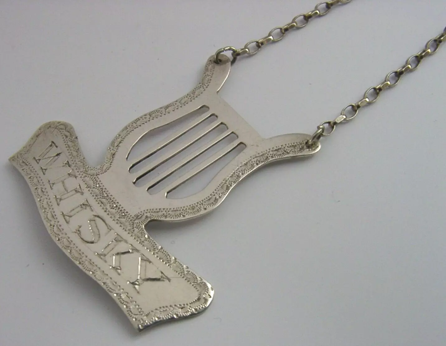 UNUSUAL ENGLISH SOLID STERLING SILVER HARP WHISKY DECANTER LABEL 2013 BARWARE