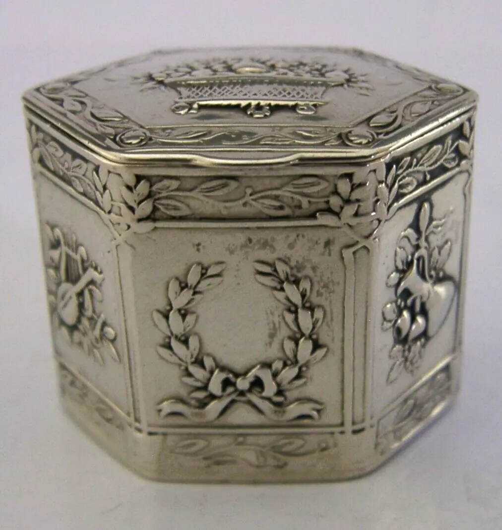 A beautiful German Hanau solid silver snuff or pill box. It is marked with the Hanau marks for Karl Kurz. I would date it to c1890-1910. It has been superbly made being embossed with various musical instruments. It is in super condition being free from dings splits holes and repairs, the inside is clean and the lid closes tightly. It measures approx. 1.25 inches (3cm) tall by 1.5 inches (3.8cm) across the base and weighs 22 grams. A very pretty piece.