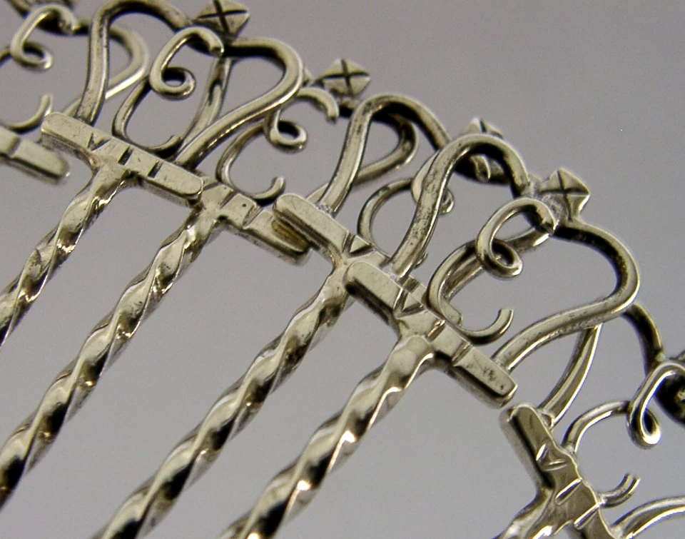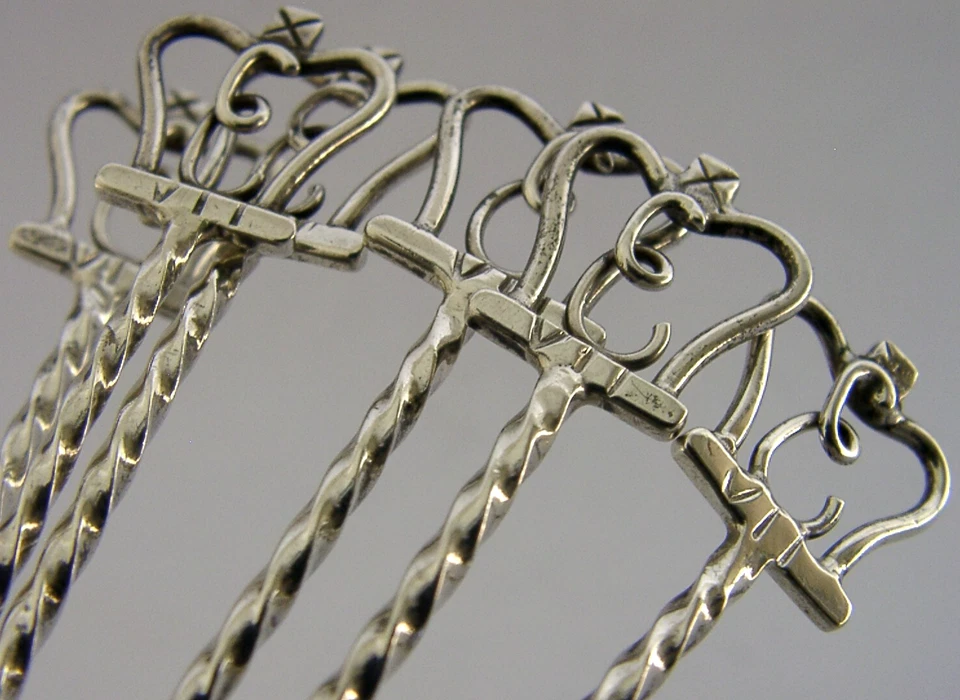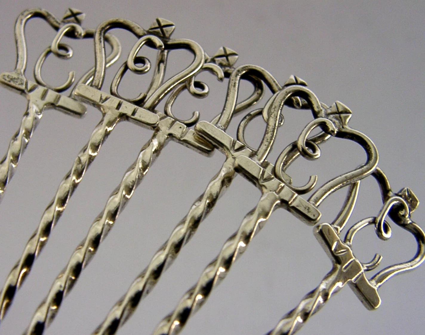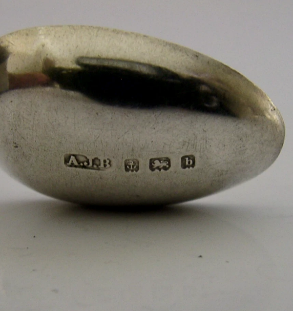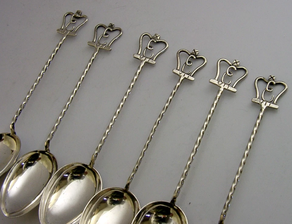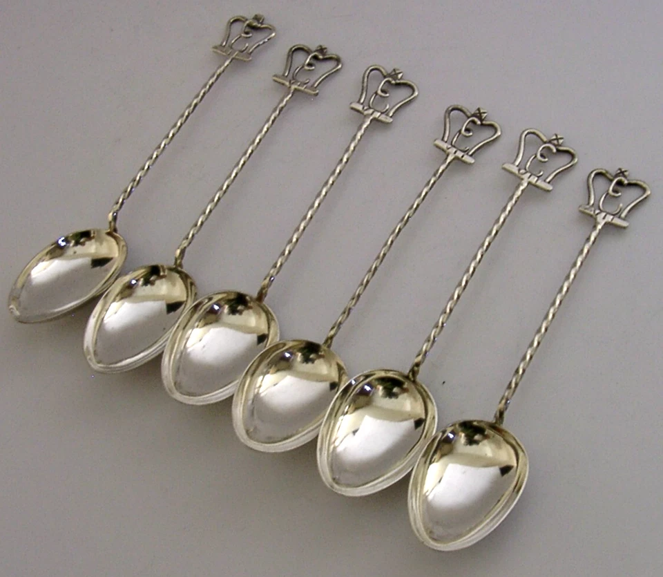 A very unusual set of English Antique sterling silver souvenir teaspoons. They are hallmarked for Birmingham 1902 with the makers marks being AJB. They have been interestingly hand made having crown shaped terminals. They are in super condition being free from dings splits and repairs. They measure 4.25 inches (11cms) long and combined weigh 45 grams. A nicely designed unusual set.