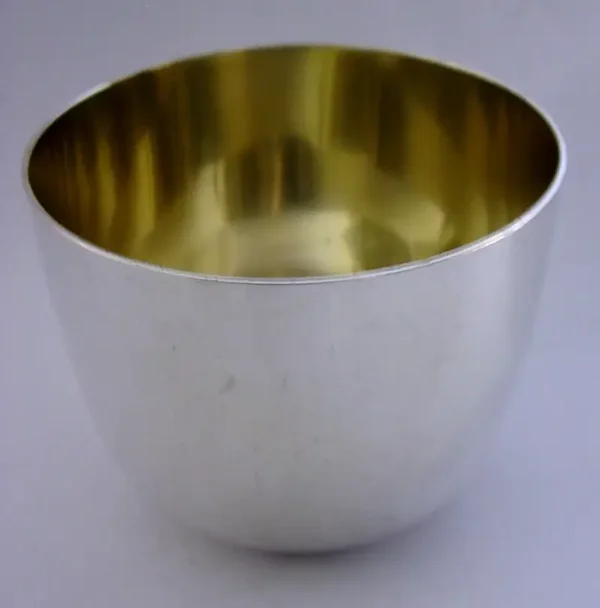 A very stylish English solid sterling silver tumbler cup. It is hallmarked for London 1968 with the makers mark being D&JW. It is been superbly designed having a round base, a copy of an earlier Georgian example designed not to tip on an uneven table top. It is in superb condition being free from dings splits holes and repairs. It measures approx. 2.5 inches (6cms) tall by 3 inches across the rim and weighs 149 grams. A superbly designed piece.