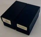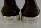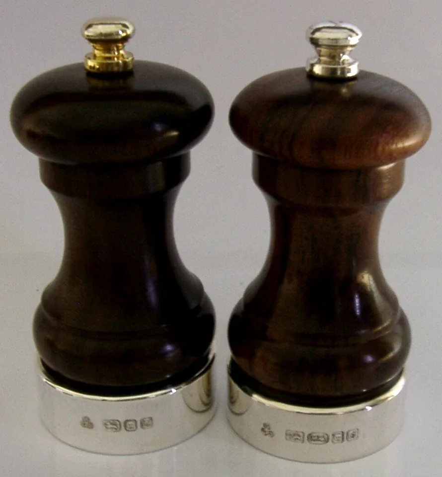 A superb English solid sterling silver salt and pepper cruet set. One is hallmarked for London 1994 the other London 2003, both made by the same maker. They have a very nice rosewood design with silver mounts, the pepper is marked P the salt has a gilded finial. They are in superb condition free from dings splits holes and repairs, in full working order but almost certainly never used. They come still boxed. They both measures approx. 4 inches (10cm) tall by 2 inches across. A very nice quality clean set.
