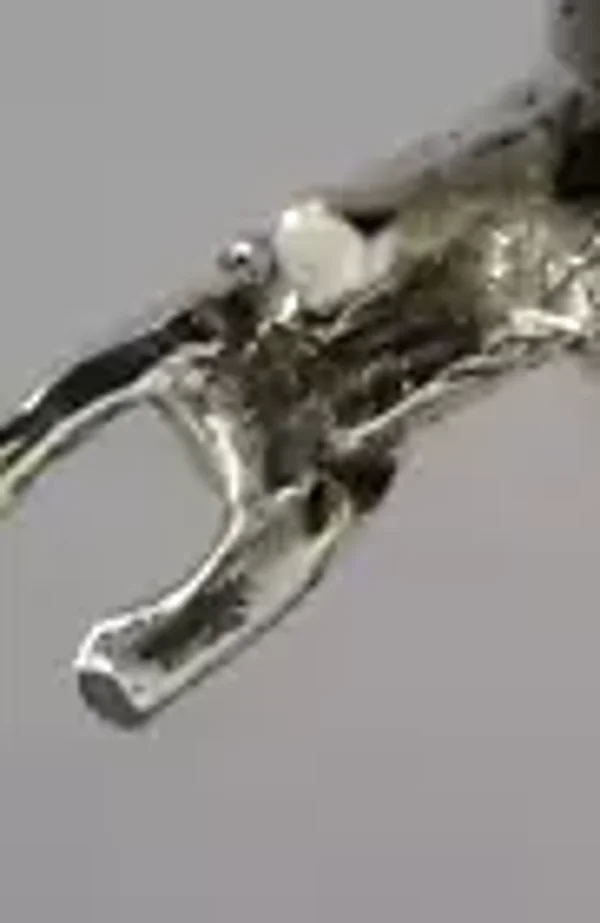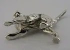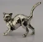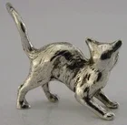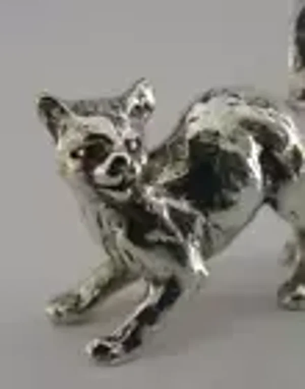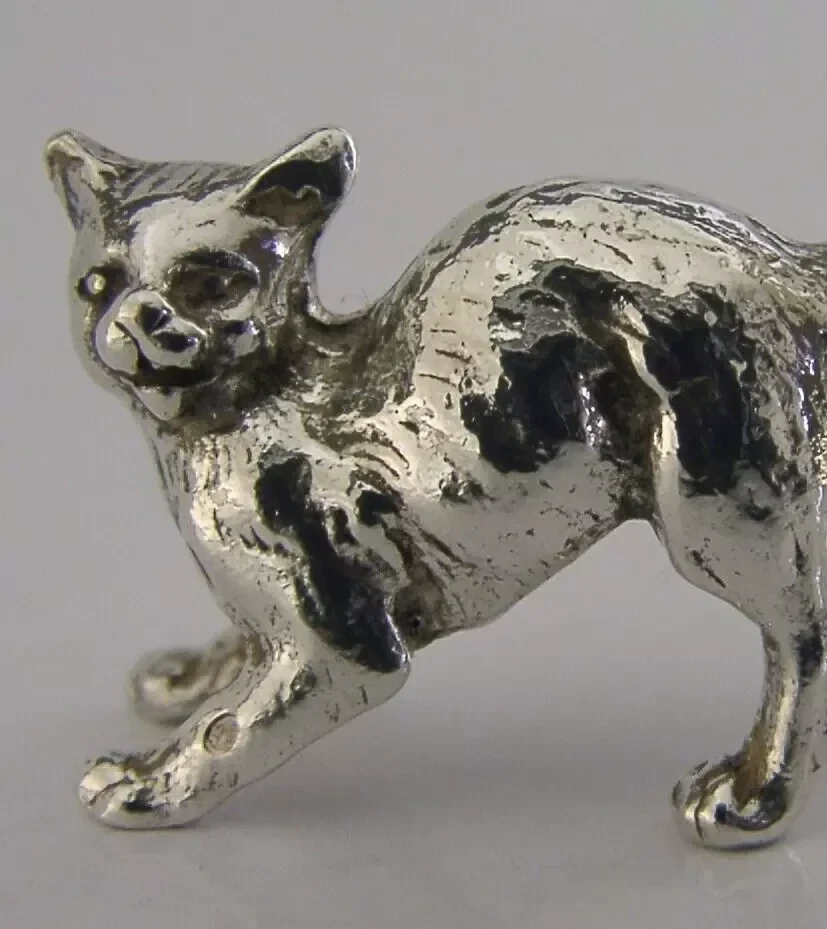 A very pretty solid cast sterling silver miniature animal figure. It is hallmarked with London import marks for c1990 (the date letter isn't readable) with the makers mark being JS MJ. It has been beautifully designed being solid cast in the form of a startled cat. It is in perfect condition being free from dings splits and repairs. It measures approx. 1.25 inch (3.2cms) long by a fraction less tall to the top of the tail and weighs 16 grams. A very pretty piece.