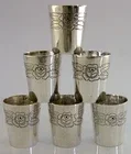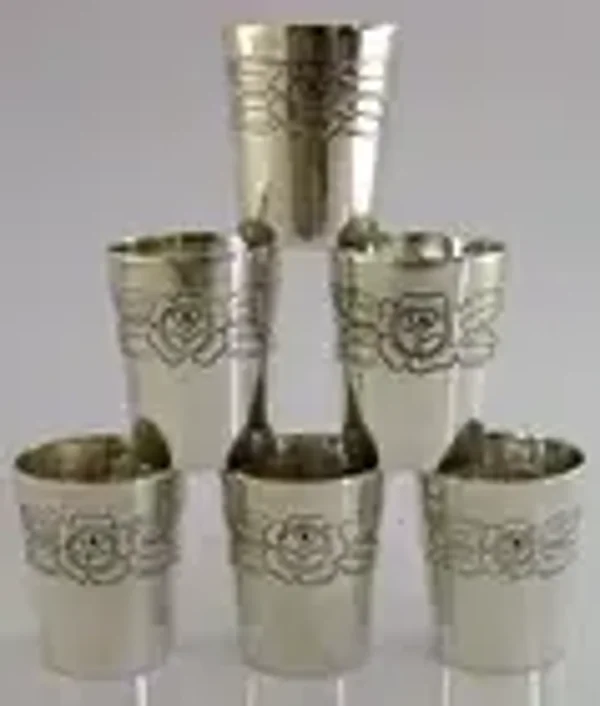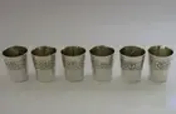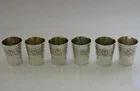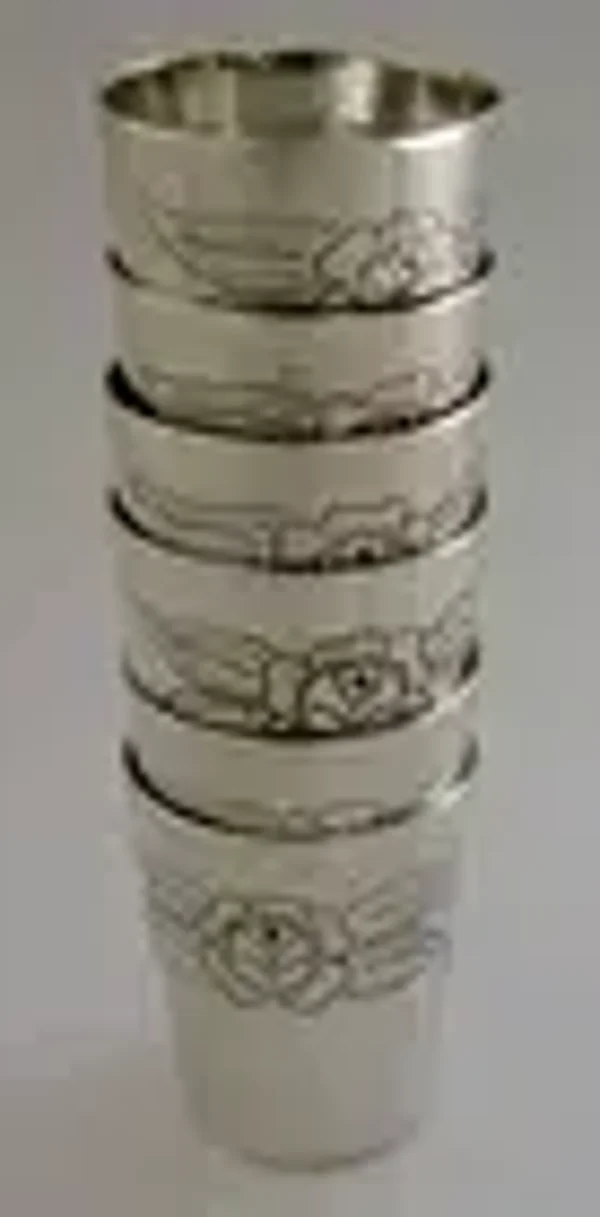 A superb set of six solid silver schnapps tot or shot cup. They are unmarked but acid test as high grade silver. I would date them to the mid 20th century most likely central European. They have been beautifully designed being decorated with roses. They is in superb condition being free from dings splits and repairs, tiny marks to one. They measure almost 1.75 inches (3.8cms) tall by 1.25 inches (3cms) across the rim and combined weigh 150 grams. A nice clean useable set.