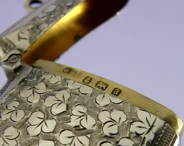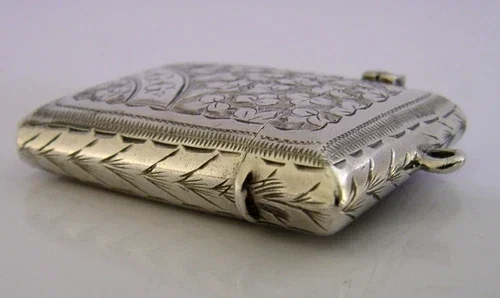 A very pretty English Victorian antique solid sterling silver vesta case. It is hallmarked for Birmingham 1900 with the maker being Rolason Brothers. It has been superbly designed being finely engraved with a shamrock design and internally gilded. The cartouche has been engraved GG. It is in super condition being free from dings splits holes and repairs, gilded inside. It measures almost 2 inches (4.8cm) tall by 1.5 inches (3.8cm) wide and weighs 22 grams. A beautifully piece.