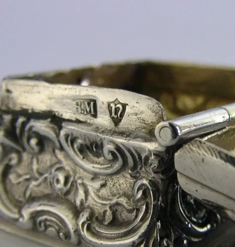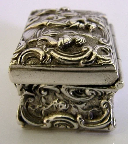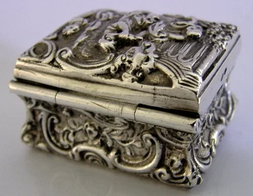 A beautiful German Hanau solid silver box. It is hallmarked with German Hanau marks along with the English import marks for London 1911 and the importer being B Muller & Son (Berthold Muller). It has been superbly made being decorated with figures and scrolls. It is in super condition being free from dings splits holes and repairs. It closes tightly. It measures approx. 1.5 inches (3.8cm) across by over 1 inch (2.8cm) by over 1 inches (2.6cm) tall and weighs 36 grams. A very well made piece.