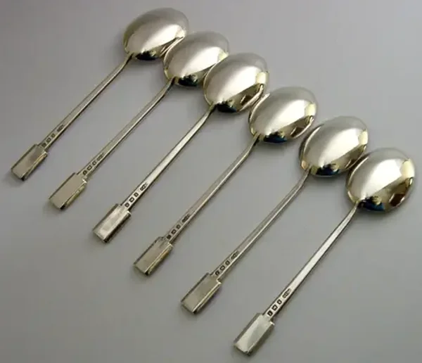 A beautiful cased set of six sterling silver and enamel spoons. They are hallmarked for Birmingham with three dating 1933 and other three 1936 all with the same maker Joseph Gloster Ltd (made and stored in different batches before being brought together for the finished set). They have been superbly made having various coloured enamelled terminals. They are in super condition being free from dings splits distortions and repairs. No chips cracks or repairs. The case is also superb. They measure approx. 3.75 inches (9.6cm) long by over 0.75 inch (2.4cm) wide and have a combined weight of 50 grams excluding the case. A very stylish set.