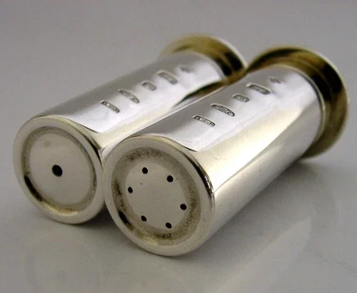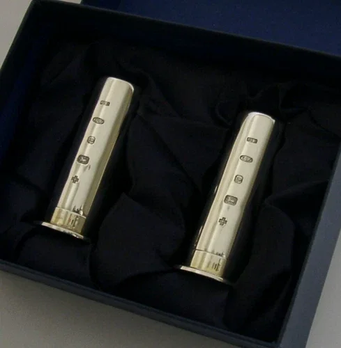 An unusual set of boxed English sterling silver salt and pepper pots. They are hallmarked for Birmingham 2000 with the maker being JBLd. They have been superb designed being in the form of cartridges. They are in mint condition being free from splits holes and repairs. They measure over 2.25 inches (5.9cm) tall by 1 inch (2.6cm) across the base and combined they weigh 65 grams excluding the box. Superbly designed well made examples.
