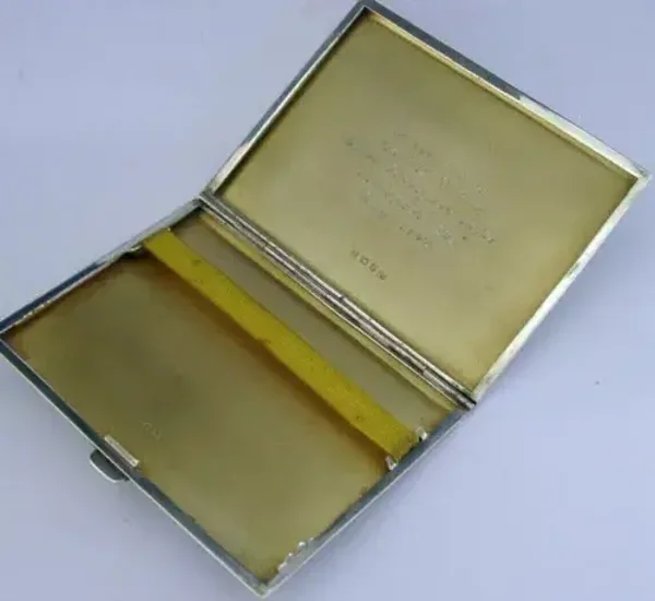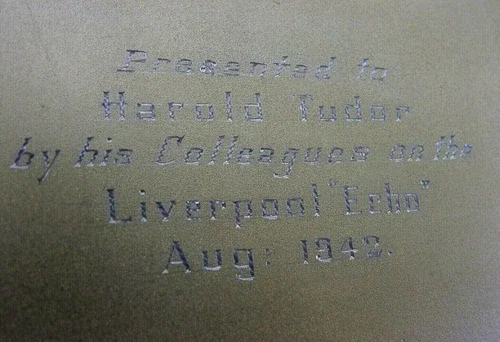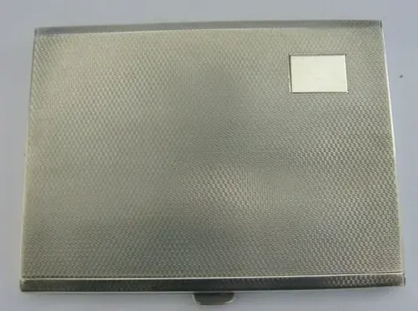 A very interesting English solid sterling silver cigarette case. It is hallmarked for Birmingham 1941 with the maker’s mark being that of John D McAllister of Glasgow. It has been superbly designed being engine turned with a vacant cartouche, the inside has been gilded and engraved with the inscription 'Presented to Harold Tudor By his Colleagues on the Liverpool "Echo" Aug 1942'. I suspect this is the same Harold Tudor who was later responsible for establishing the Eisteddfod Music and Poetry Festival? It is in superb condition being free from dings splits and repairs. It measures approx. 4.5 inches (11.5cms) long by over 3.25 inches (8.6cms) wide and weighs 158 grams. A superbly made high-quality very interesting piece.