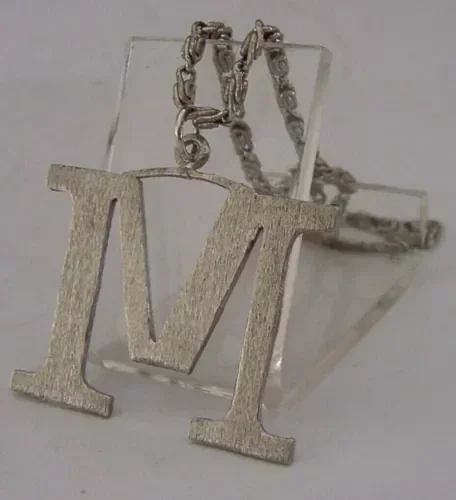 A very nice quality English solid sterling silver decanter label. It is hallmarked for London 1973 with the maker’s marks being HJ. It has been hand made being in the form of the letter M with a textured finish. It is in super condition being free from dings splits and repairs. It measures approx. 1.5 inches (3.2cms) tall by 1.75 inches (4.6cms) wide and complete with its chain weighs 12 grams. A very nicely made clean piece.
