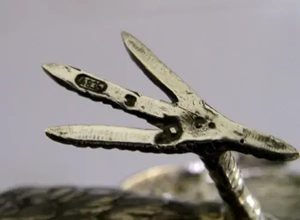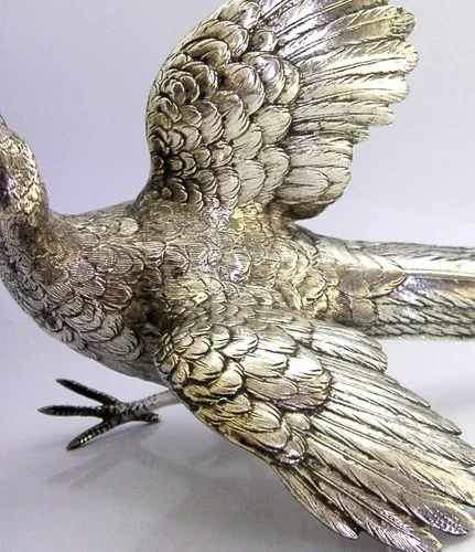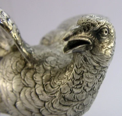 A superbly modelled large silver bird figure. It is hallmarked with the Belgium A835 silver mark and I would date it to c1960s. It has been beautifully modelled being finely cast in the form of a pheasant bird. It is in super condition being free from dings splits and repairs. It measures approx. 9.5 inches (24.2cm) long beak to tail by 5.5 inches (14cm) wide across the wings by over 4.5 inches (11.8cm) to the top of the wing and weighs 274 grams (all silver weight, i.e. it is not filled). A very well designed high quality rare example.