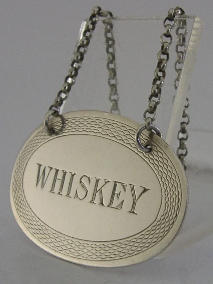 A superb quality rare English antique solid sterling silver Irish whiskey decanter label. It is hallmarked for London 1923 the maker being S J Rose & Son. It has been well designed with the centre being engraved WHISKEY the Irish or American spelling. It is in superb condition being free from dings splits and repairs. It measures over 1.75 inches (4.7cm) wide by almost 1.25 inches (3cm) tall excluding the chain and complete with its chain weighs 12 grams. A very nicely designed piece.