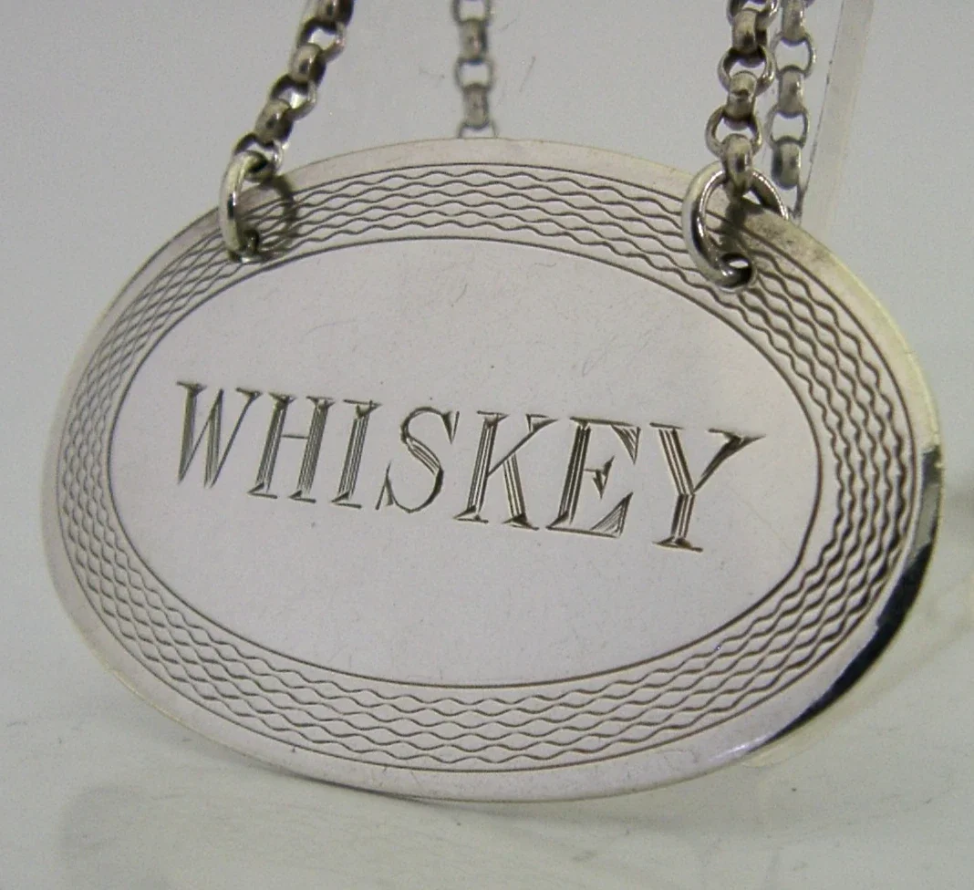 RARE ENGLISH STERLING SILVER IRISH WHISKEY DECANTER LABEL 1923 BARWARE ANTIQUE