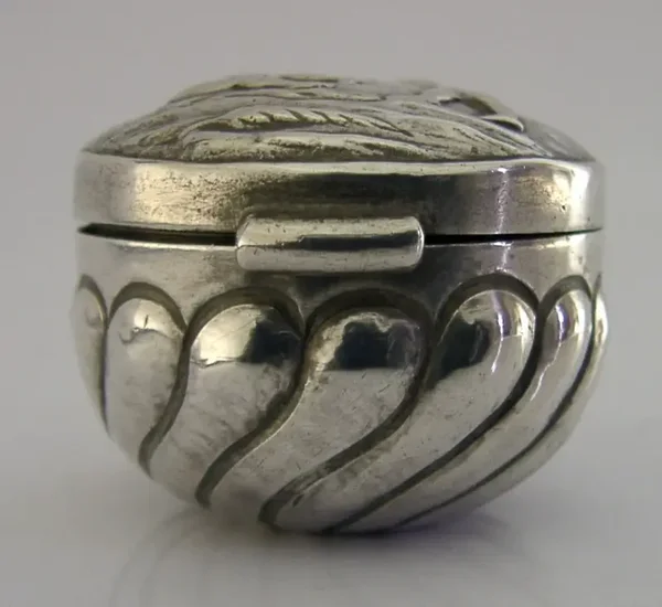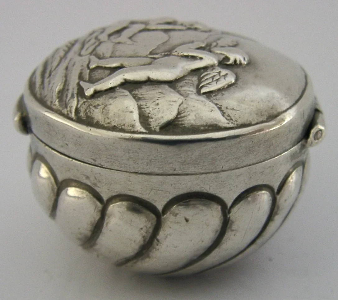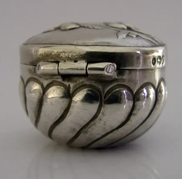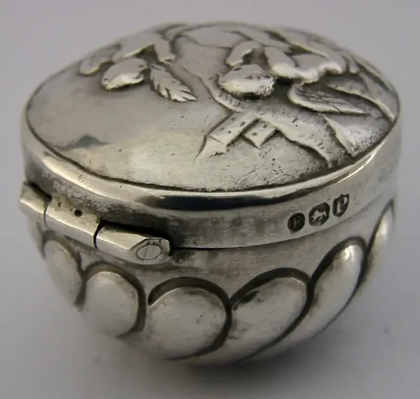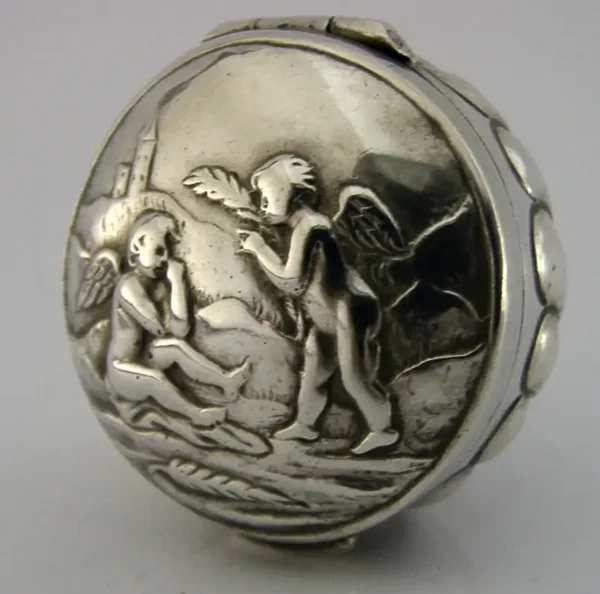 A very pretty English import antique solid sterling silver box. It is hallmarked with the German Hanau mark of B. Neresheimer & Sohne to the base and London Import marks for 1890 to the rim. It has beautifully made depicting a cherubs or angels to its lid. It is in super condition being free from dings splits holes and repairs. The inside is clean and it measures approx. 1.5 inches (3.8cm) across by 1.25 inches (3.2cm) tall and weighs 30 grams. A beautiful rare piece.