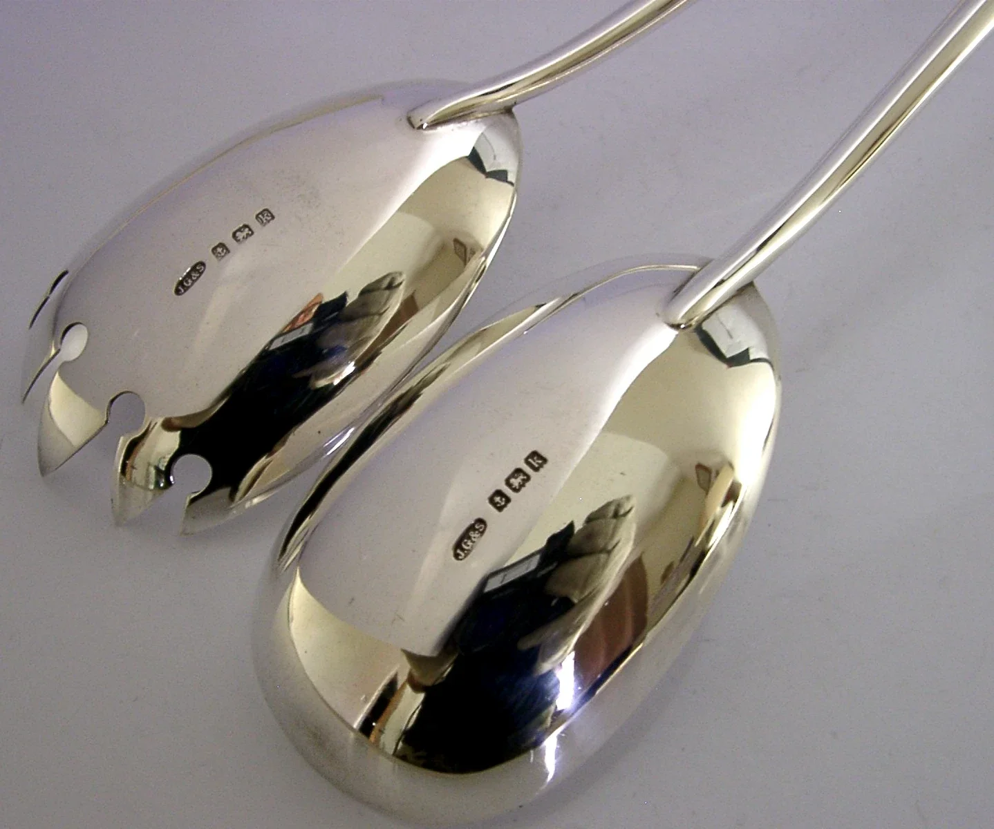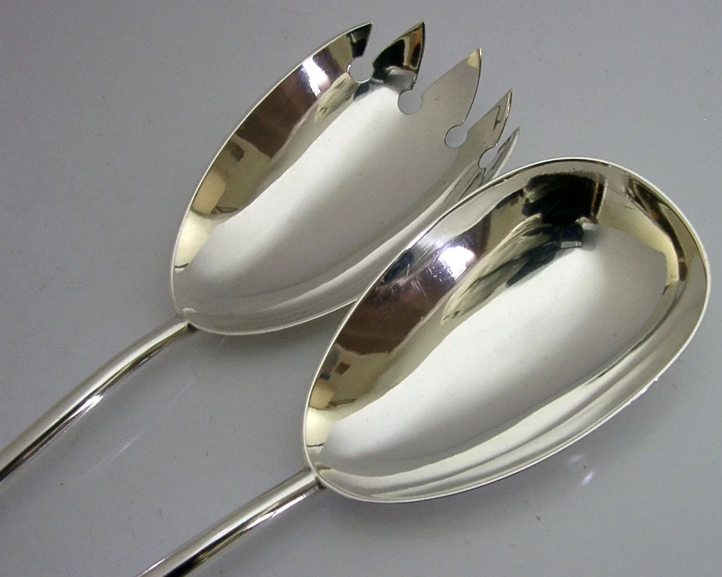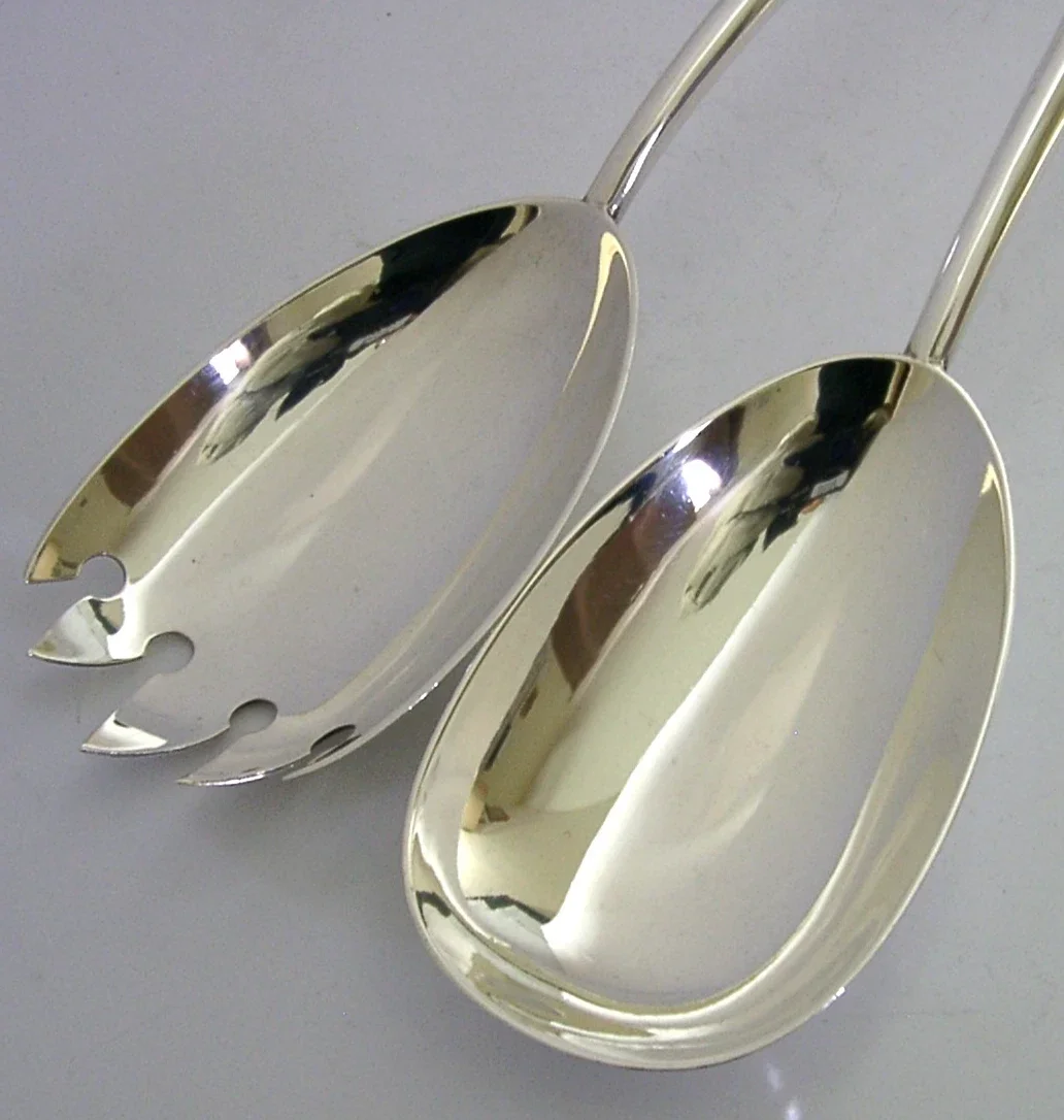 A beautiful Arts and Crafts set of solid sterling silver salad servers. They are hallmarked for Birmingham 1909 with the maker being John Grinsell & Sons. They have been beautifully designed and are in superb condition being free from dings splits distortions and repairs. They measure approx. 9.75 inches (24.8cm) long by 1.75 inches (4.6cm) wide and have a combined weight of 92 grams. A well-made well designed set.