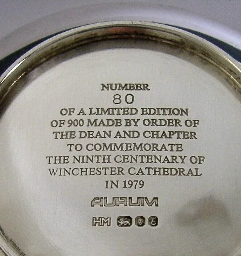 A superb rare English solid sterling silver limited edition bowl or porringer. It is hallmarked for London 1979 with the makers marks being HM for Hector Miller. It has been made as a limited edition being number 80 of 900 made by order of the Dean and Chapter to commemorate the ninth centenary of Winchester Cathedral. It is in super condition being free from dings splits and repairs. It is nice and clean inside. It measures 6.75 inches (17cm) across including the handle and 4.5 inches (11.6cm) excluding it by over 1.25 inches (3.5cm) tall to the rim and weighs 220 grams. A rare piece.