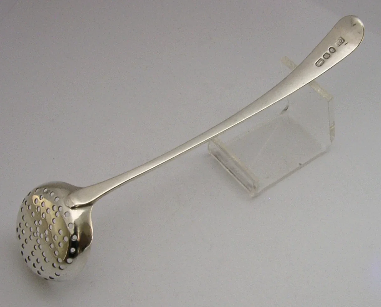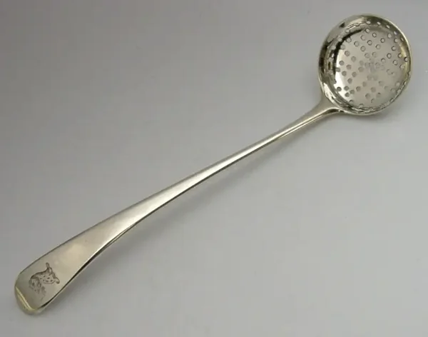 A nice quality English Georgian antique solid sterling silver sugar sifter spoon. It is hallmarked for London 1788 with the maker being George Smith (III) & William Fearn. It has been made to what is termed the Old English Pattern and has been engraved with a leopard breathing fire crest similar to that used by the Stephenson Family. It is in super condition being free from dings splits and repairs. It measures approx. 6.75 inches (17.2cm) long by 1.5 inches (3.7cm) wide and weighs 32 grams. A very nice quality usable piece.