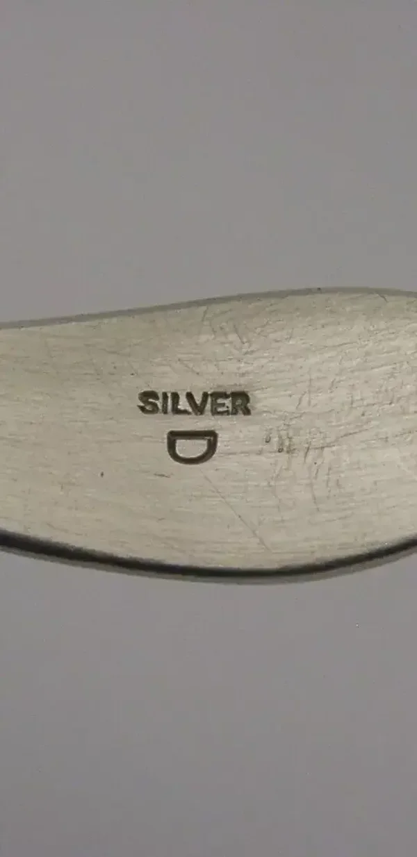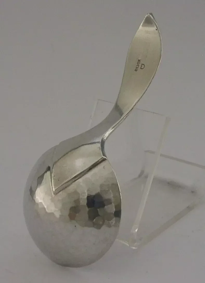 A superb hand made solid silver caddy spoon. It is marked SILVER D and tests as high grade silver. I would date it to c1960s. It has been beautifully designed in a Arts & Crafts style being plannished. It is in super condition being free from dings splits distortions and repairs. It measures approx. 3.75 inches (9.2cm) long by 1.5 inches (4cm) wide and weighs 24 grams. A very nice example.