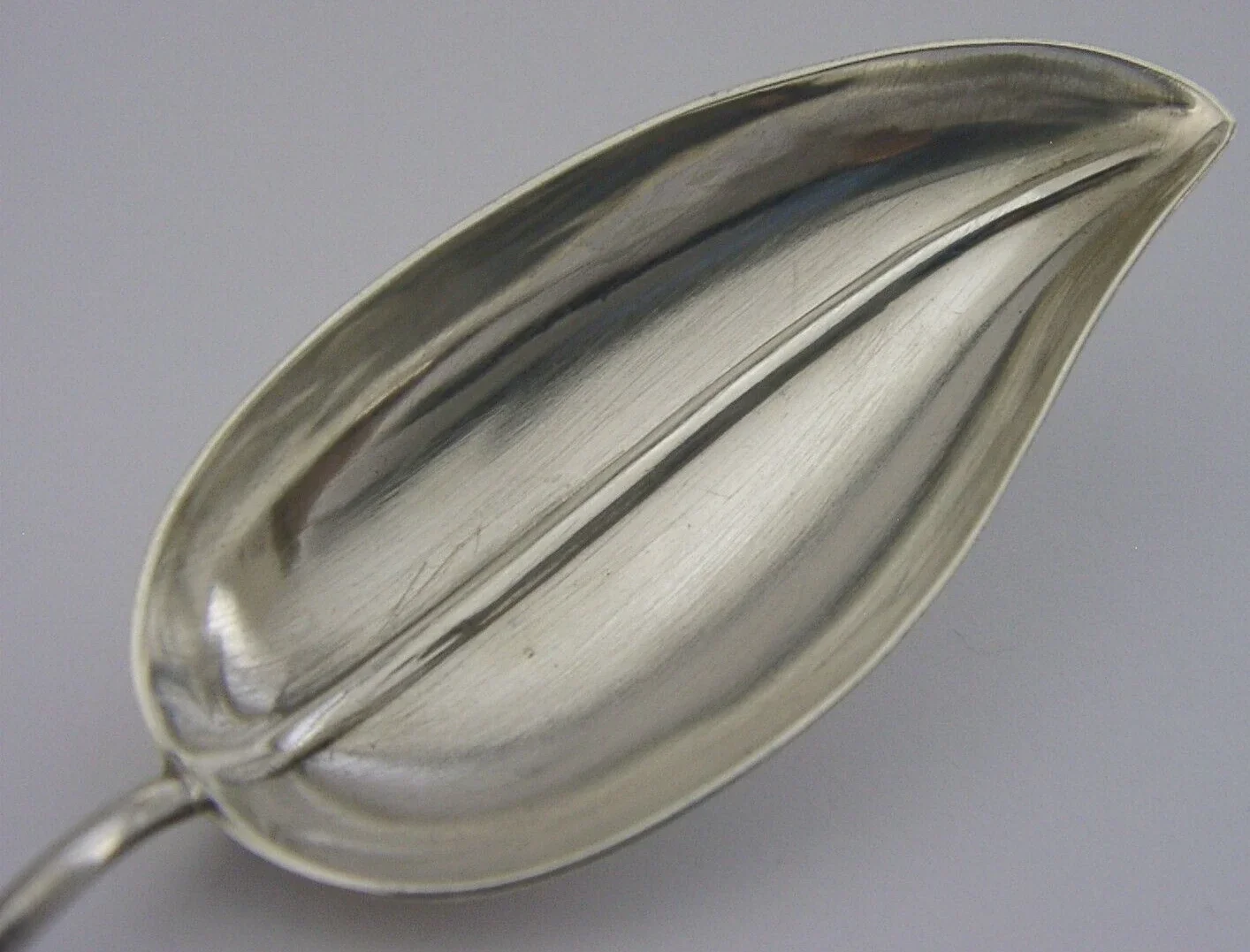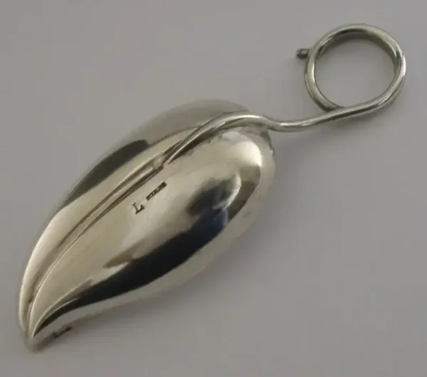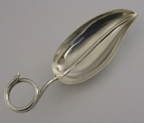 A superb American solid sterling silver caddy spoon. It is marked STERLING with the makers mark of Lebkuecher & Co who operated in Newark, New Jersey from c1896 to 1909. It has been superbly designed with the bowl being in the form of a leaf and a looped stem terminal. It is in super condition being free from dings splits distortions and repairs. It measures approx. 3.5 inches (9cm) long by 1.25 inches (3.2cm) wide and weighs 20 grams. A beautifully made example.