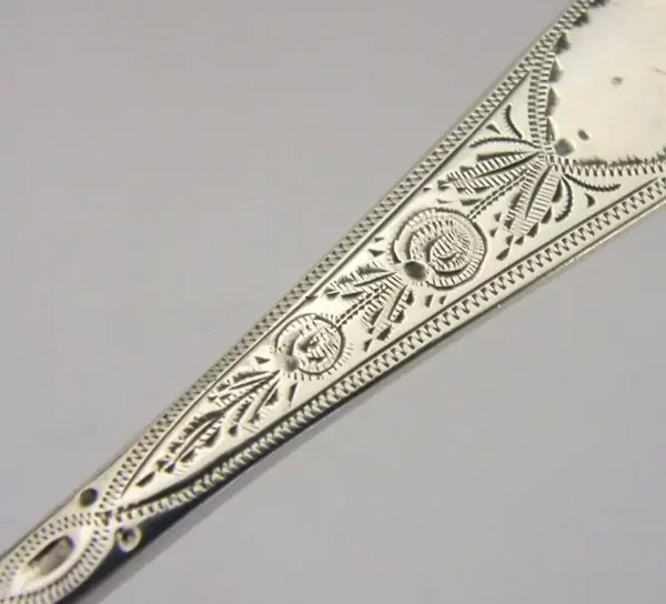 A super quality English Victorian antique solid sterling silver sugar sifter spoon. It is hallmarked for London 1841 with the maker being Charles Boyton (I). It has been beautifully made having a ornate bowl decorated with fruit and berries. It is in superb condition being free from dings splits and repairs. It measures approx. 5.75 inches (14.6cm) long by over 2.25 inches (6.1cm) wide and weighs 38 grams. A very pretty piece.