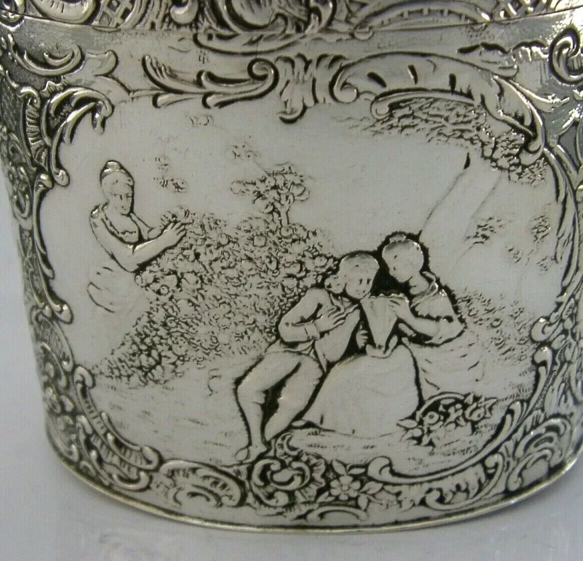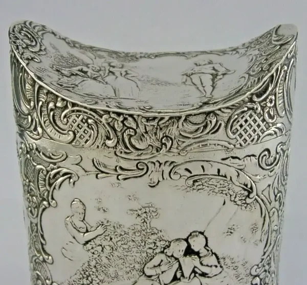 A beautiful Hanau (Germany) solid silver tea caddy box. It is hallmarked with two marks to the base and tests as high grade silver. I would date it to c1890-1910. It has been beautifully shaped and finely embossed with romantic scenes. The inside has been vibrantly gilded. It is in super condition being free from dings splits holes and repairs, slight push to the base edge, not visible, see final photo. The inside is clean and the hinge is strong. It measures approx. 3.75 inches (9.5cms) tall by 3.25 inches (8.2cms) across by 2.25 inches (5.8cms) wide and weighs 155 grams. A beautiful piece.