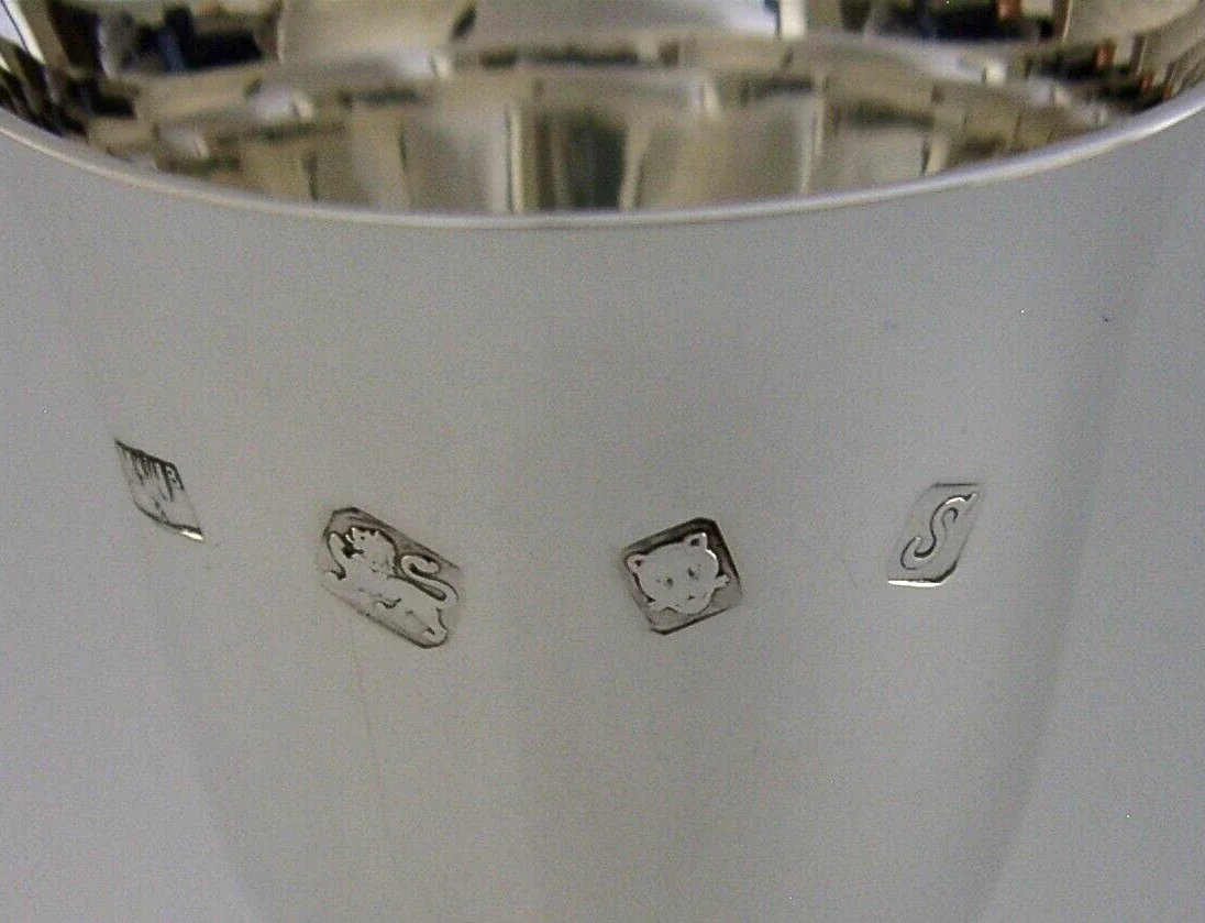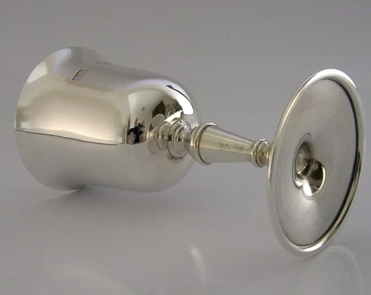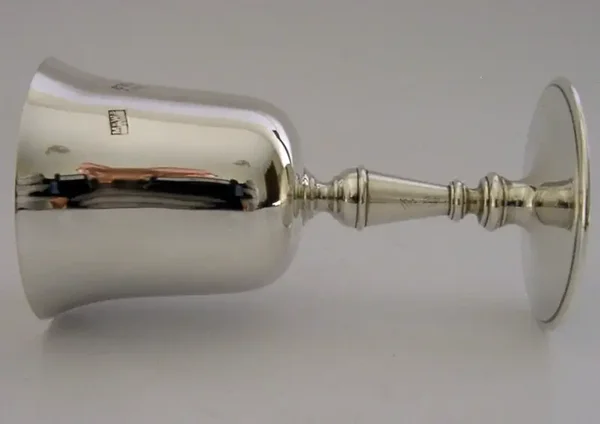 A very nice quality English solid sterling silver goblet. It is hallmarked for London 1973 with the makers mark being that of Mappin & Webb. It has been superbly designed and is in superb condition being free from dings splits distortions and repairs. It measures approx. 4.25 inches (10.6cm) tall by over 2 inches (5.6cm) across the rim by over 2 inches (5.4cm) across the base and weighs 103 grams. A very good quality well made piece.