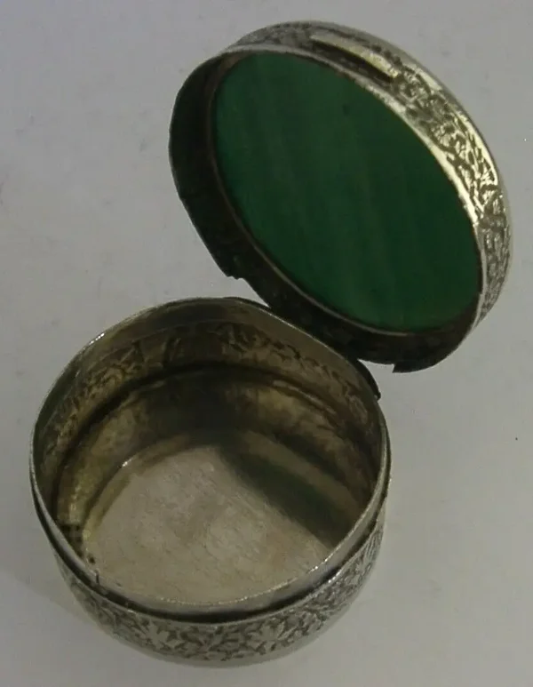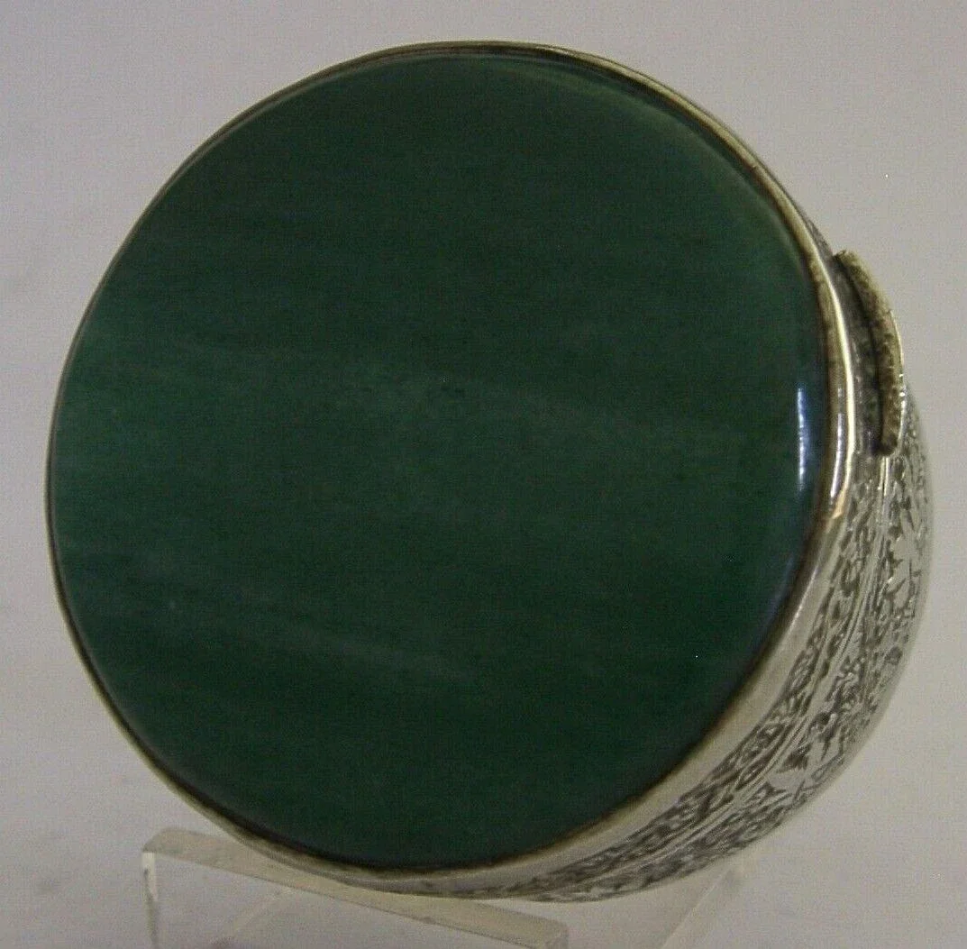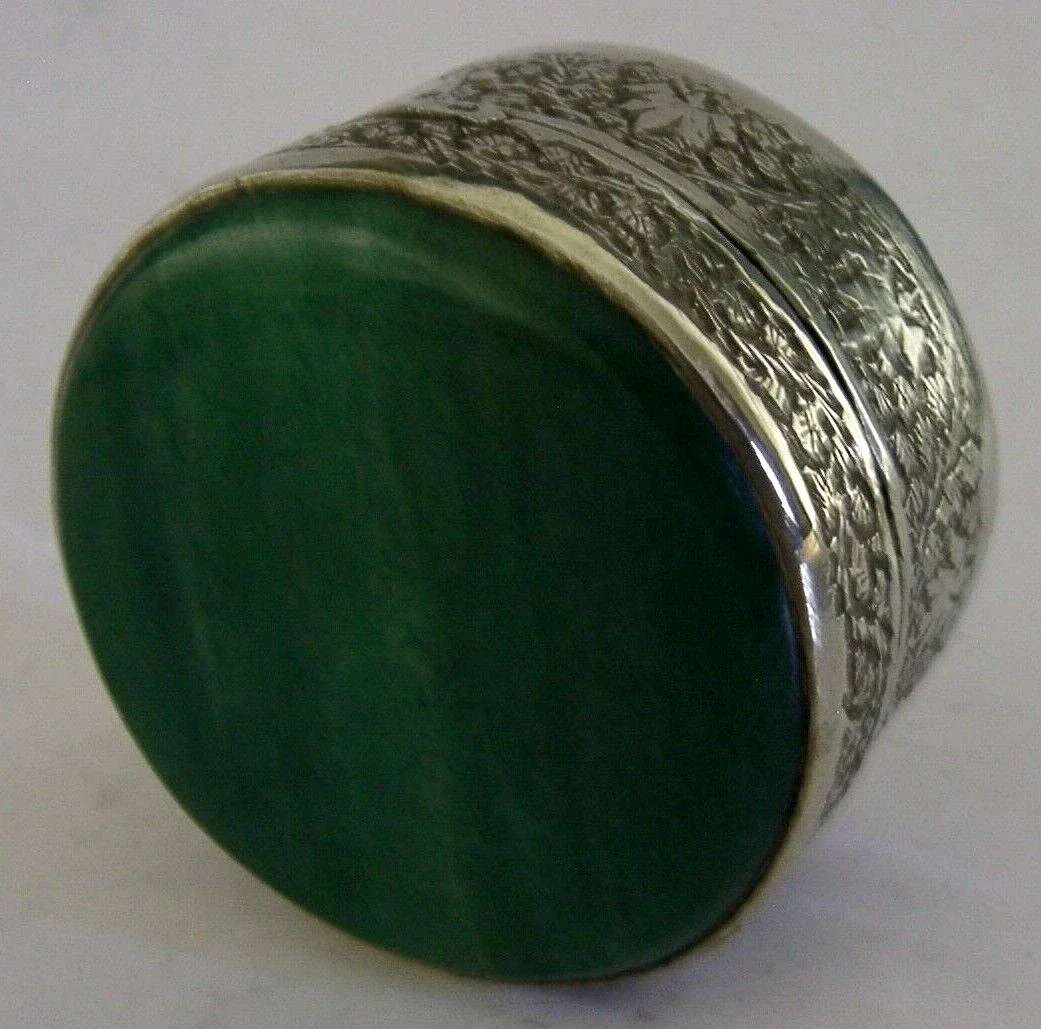 A beautiful solid silver Indian table box. It is unmarked but tests as high grade silver. I would date it to c1920. It has been beautifully hand made embossed and chased with a leaf design and the lid is set with a green agate. It is in superb condition being free from dings splits chips cracks holes and repairs. It measures approx. 2 inches (5.3cms) across by 1.25 inches (3.2cms) tall and weighs 70 grams. A superbly designed very high quality example.