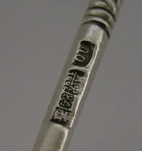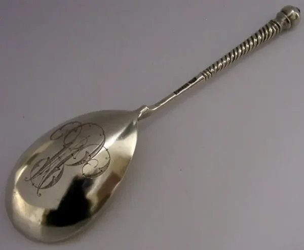 A rare Russian antique solid silver serving spoon. It is hallmarked with Russian marks for 1896. It has been superbly designed with the back of the bowl being engraved with entwined initial's. It is in super condition having no dings splits distortions or repairs. It measures approx. 7.5 inches (19cm) long by 2 inches (5cm) wide and weighs 86 grams. A rare high quality piece.
