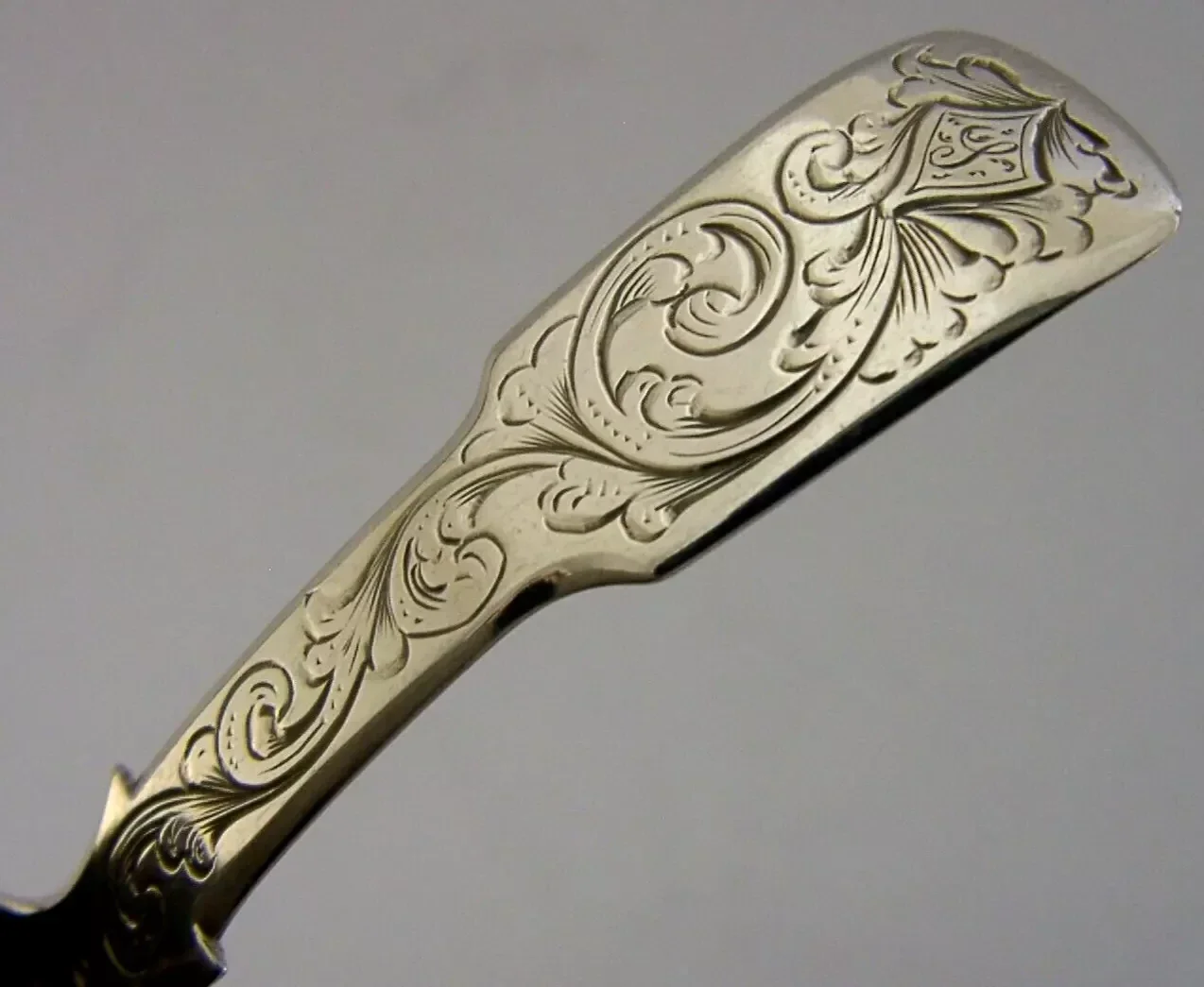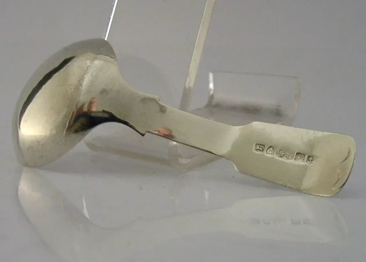 A beautiful English antique solid sterling silver caddy spoon. It is hallmarked for Birmingham 1839 with the maker being George Unite. It has been superbly made being engraved with a scrolls design to its handle and the cartouche engraved with the single initial S. It is in super condition being free from dings splits distortions and repairs. It measures approx. 3.25 inches (8.4cm) long by over 1.25 inches (3.4cm) wide and weighs 8 grams. A very nice example.