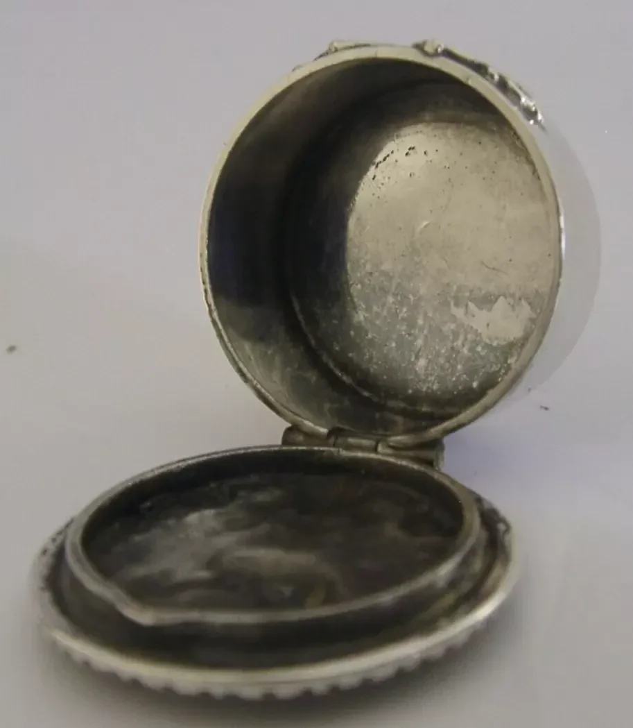 A very pretty solid sterling silver pill box. It is hallmarked for London 1986 with the makers marks being BAC. It has been beautifully made having an Art Nouveau style. It is in superb condition being free from dings splits and repairs. It measures approx. 1.25 inches (3cms) across by 0.25 inches tall and weighs 21 grams. A superbly designed pretty example.