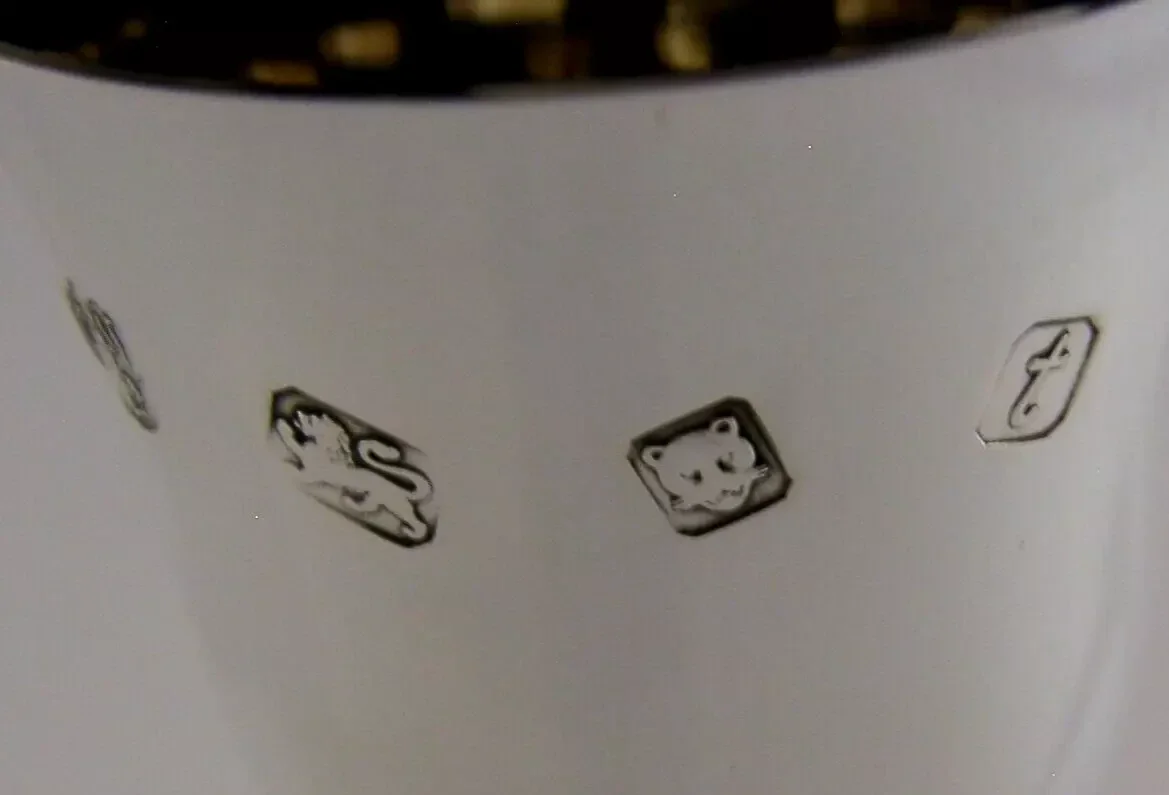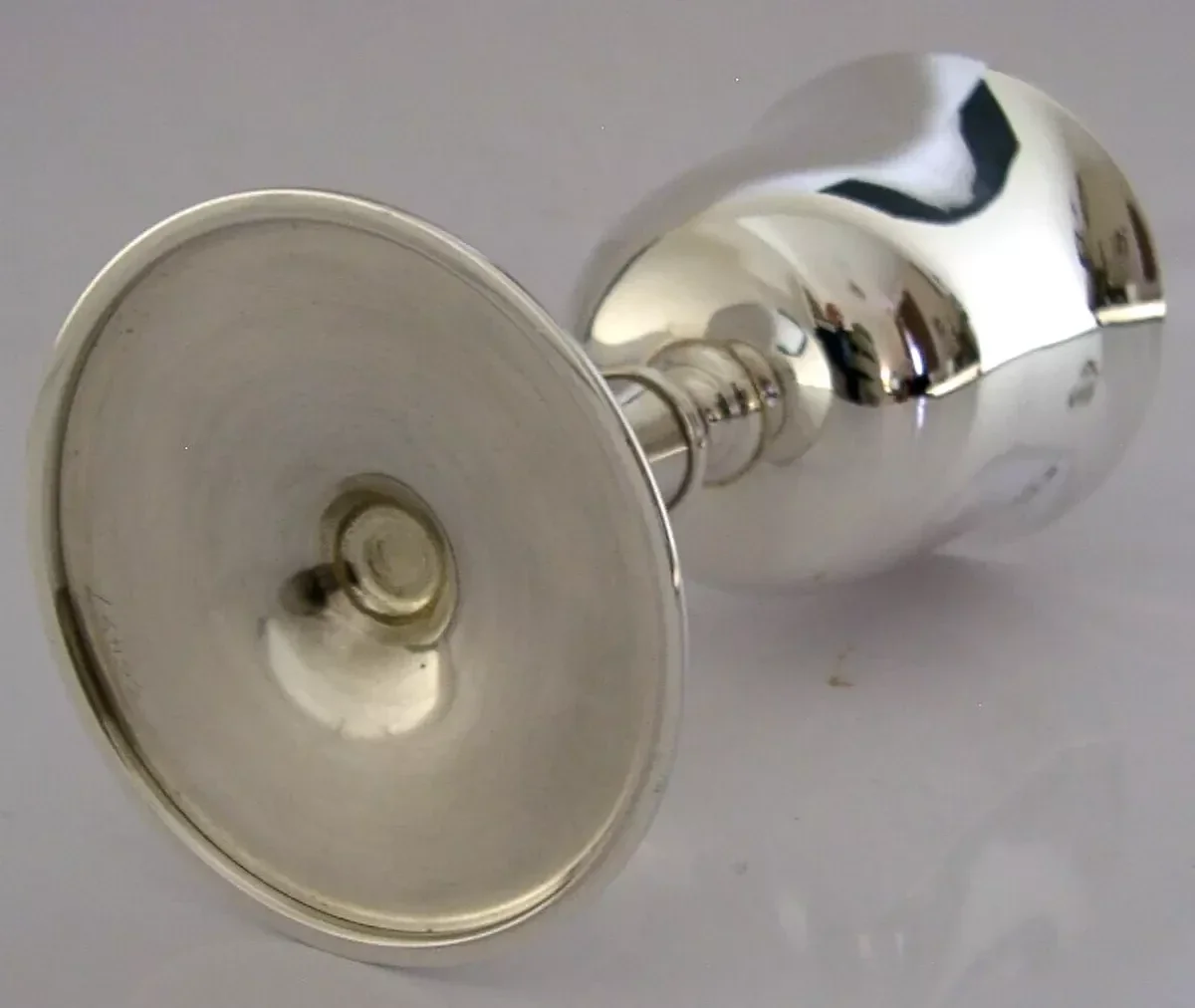 A beautiful English solid sterling silver wine goblet. It is hallmarked for London 1974 with the makers marks being that of C J Vander Ltd. It has been superbly designed and is in superb condition being free from dings splits distortions and repairs. It measures approx. 4.25 inches (10.6cm) tall by 2 inches (5.1cm) across the rim by the same across the base and weighs 100 grams. A very good quality well made piece.