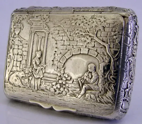A beautiful German Hanau solid sterling silver table box. It is hallmarked with German Hanau marks along with the English Import marks for London 1898 with the importer being John George Smith. It has been superbly designed depicting country scene. It is in super condition being free from dings splits holes and repairs, the inside is clean and gilded. It measures approx. 3 inches (7.6cm) across by 2.25 inches (5.6cm) wide by 0.75 inch (1.9cm) tall and weighs 76 grams. A very well made piece.
