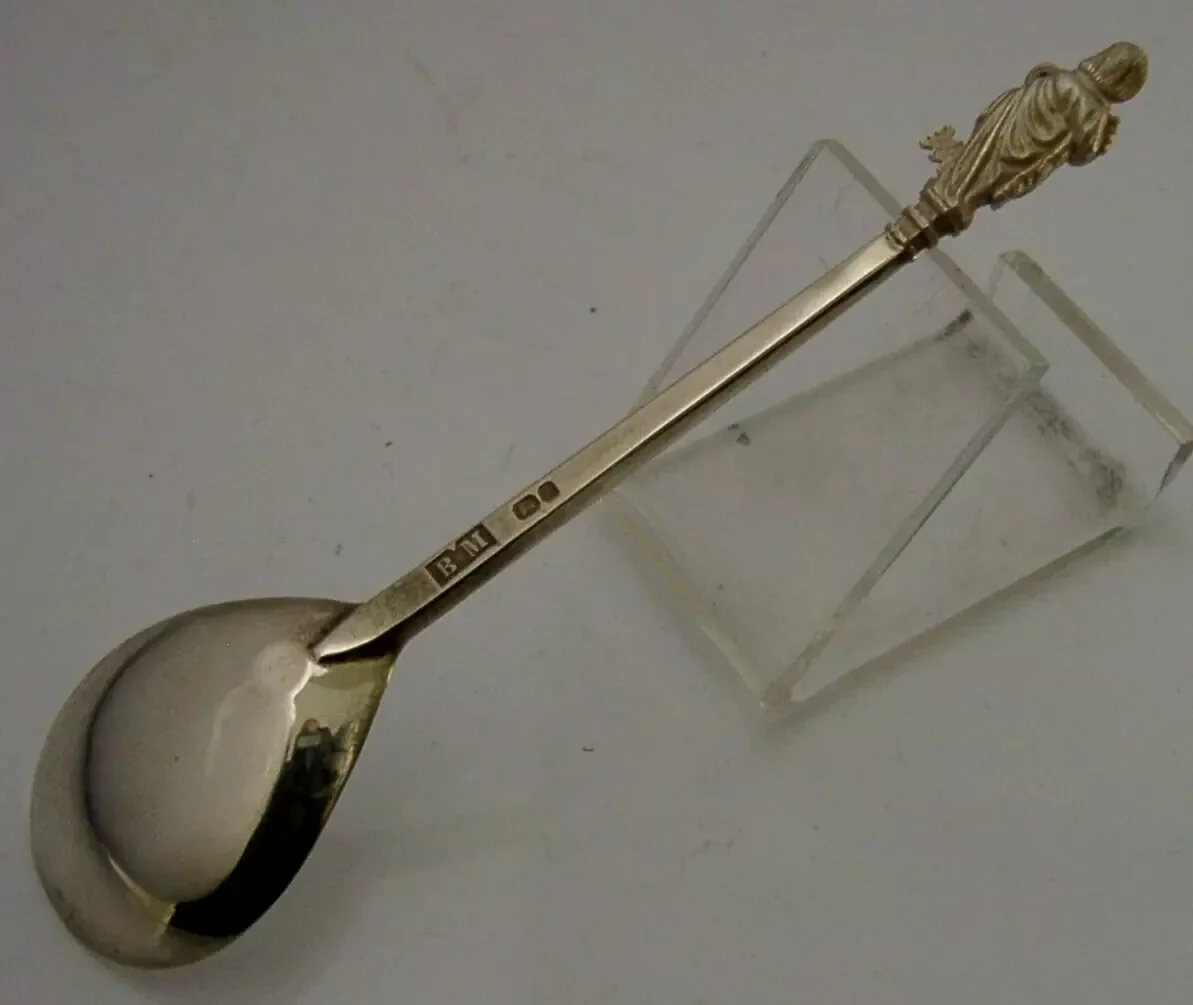 A superb English solid sterling silver apostle spoon. It is hallmarked for Birmingham 1979 with the maker being BM. It has been beautifully made with the terminal being in the form of a St Peter. It is in super condition being free from dings splits and repairs. It measures approx. 4.75 inches (12cm) long by 1.25 inches (3.2cm) wide and weighs 23 grams. A very well made piece.