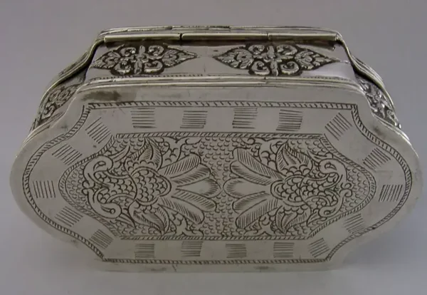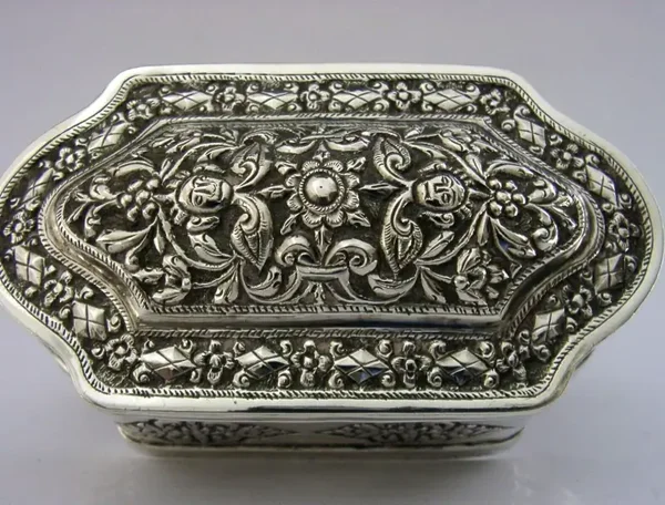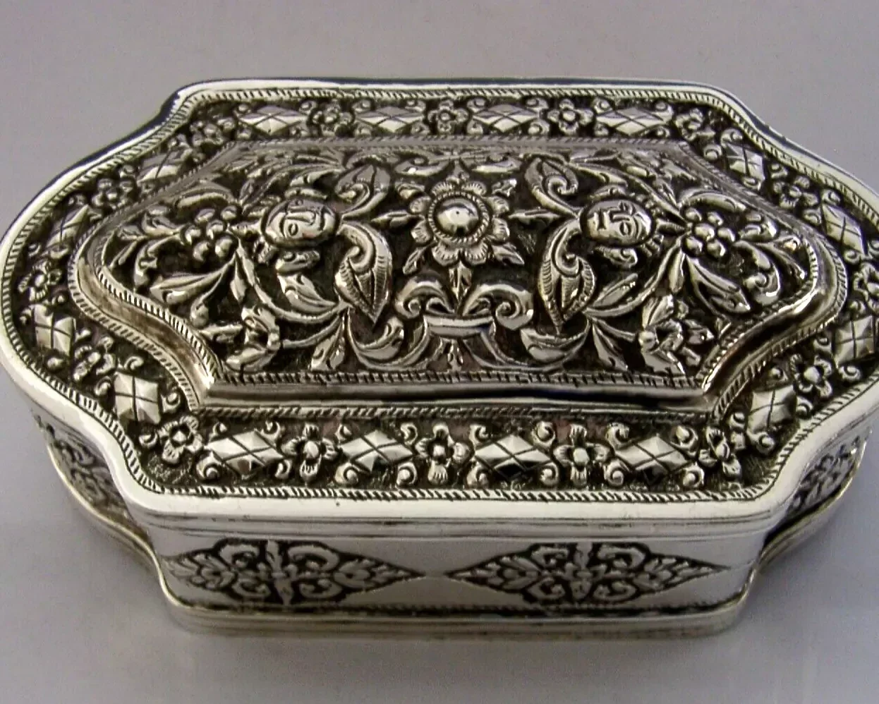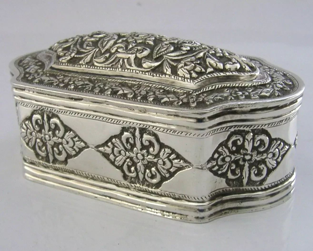 A beautiful decent sized solid silver Indian or Ceylon box. It is unmarked but tests as high grade silver. I would date it to c1900. It has been beautifully hand made being embossed and chased with scrolls and flowers and two faces, possibly Gods. It is in superb condition being free from dings splits holes and repairs. It measures approx. 4.25 inches (10.9cm) long by 2.5 inch (6cm) wide by 2 inches tall and weighs 132 grams. A superbly designed beautiful example.